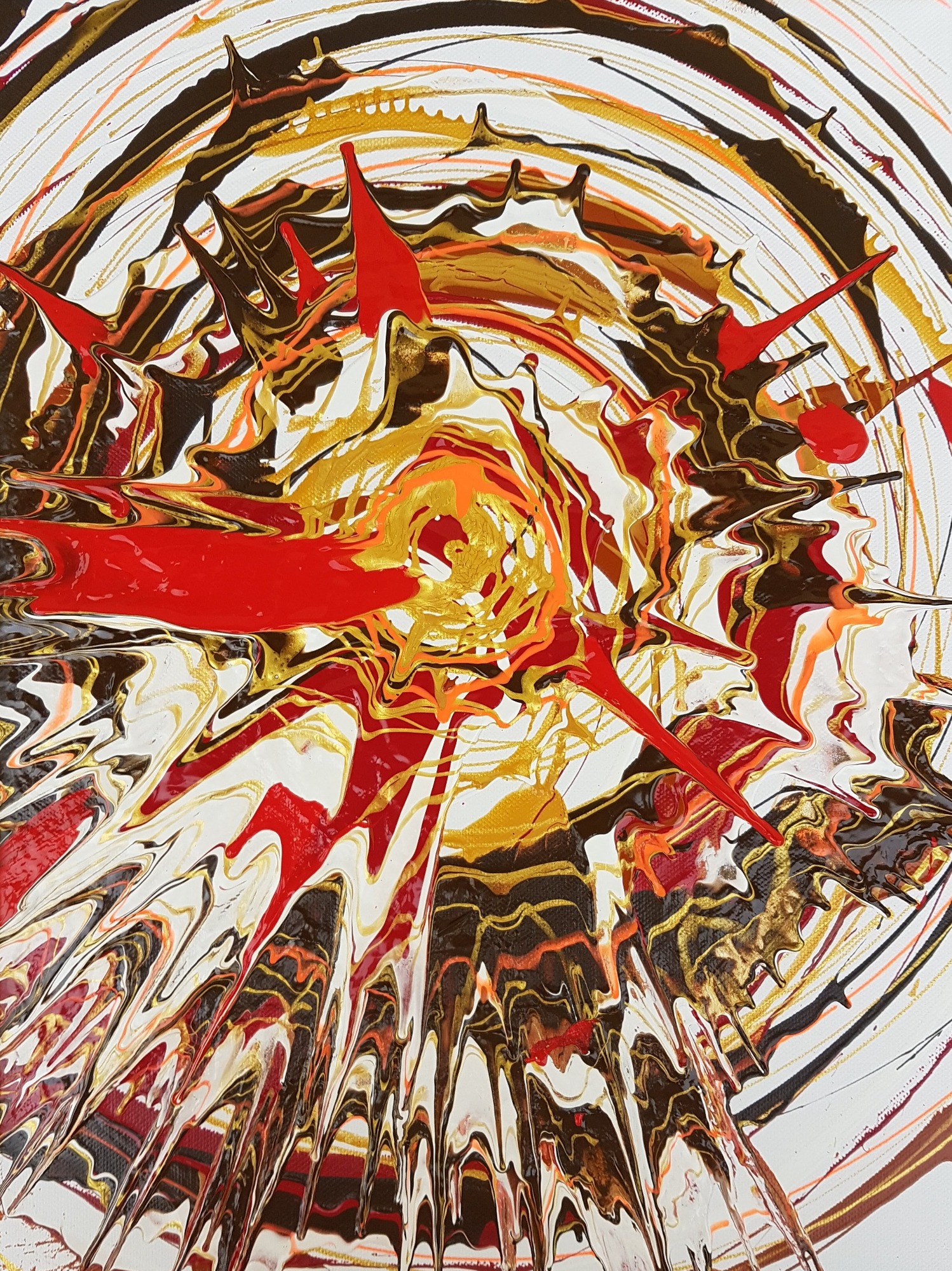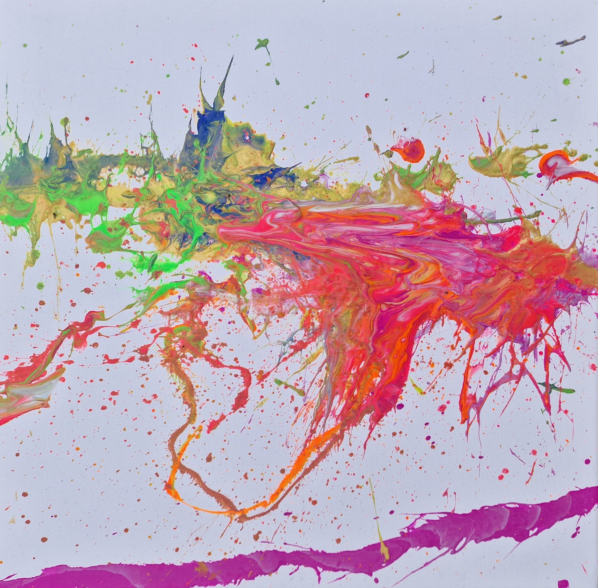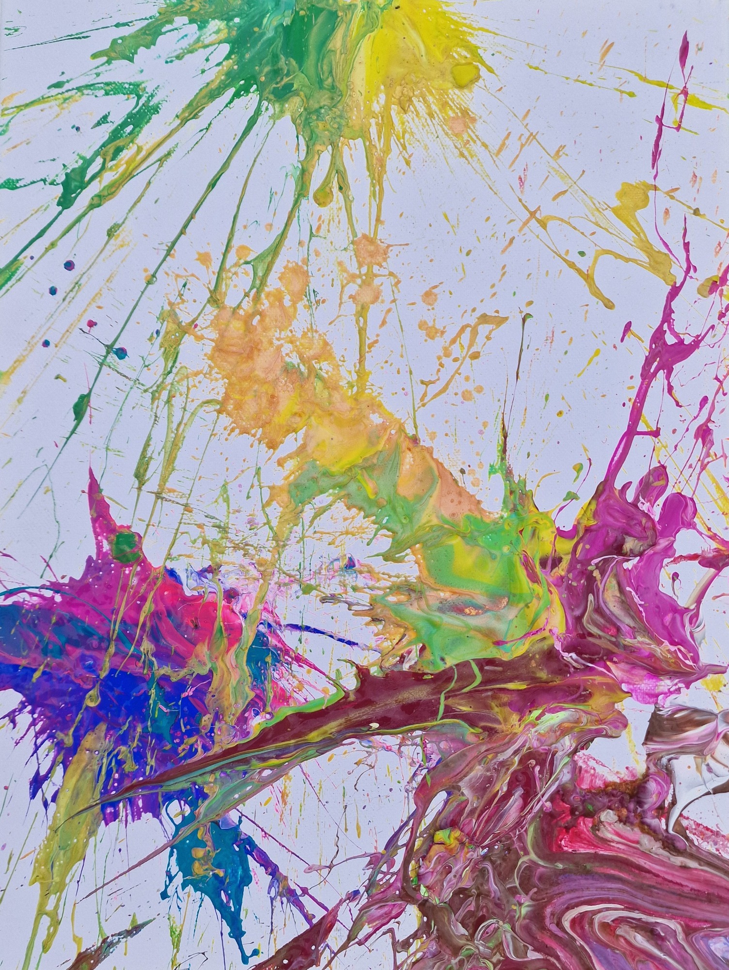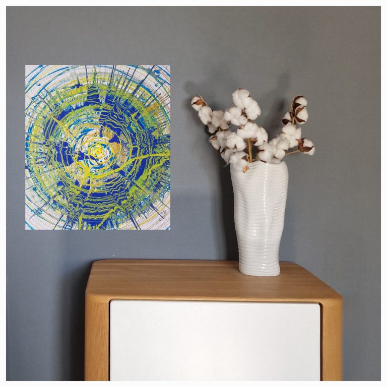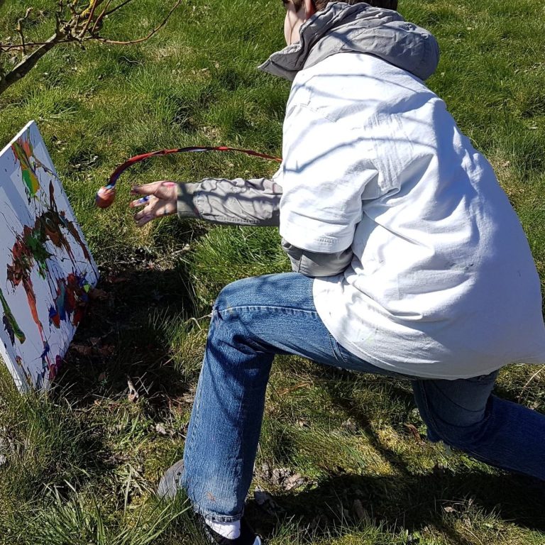 Es entstehen faszinierende, kreisförmige Bilder, die durch die Rotation der Leinwand und die zufälligen Farbtropfen erzeugt werden. Vorsicht ist geboten: Die Farbe spritzt in alle Richtungen, und man sollte sich darauf einstellen, dass Farbspritzer überall landen können.