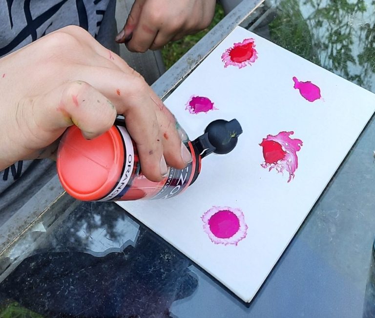Jetzt kommt der spaßige Teil! Nutze die Leinwandpappen wie Frisbees und wirf sie quer durch den Garten. Du wirst überrascht sein, wie die Farben durch die Bewegung ineinander verlaufen und sich einzigartige Muster bilden.