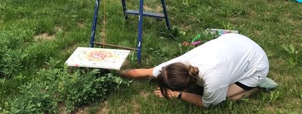 Für diese künstlerische Technik benötigt man einen Akkuschrauber. Darauf wird eine Platte montiert. Auf dieser Platte wird eine Leinwand mithilfe von doppelseitigem Klebeband befestigt. Eine Person legt sich auf den Boden und betätigt den Akkuschrauber, sodass die Leinwand sich gleichmäßig dreht. Eine zweite Person steigt auf eine Leiter und lässt wasserlösliche Farbe auf die drehende Leinwand tropfen. Die Farbe sollte nicht zu dickflüssig sein, damit sie schön verläuft.