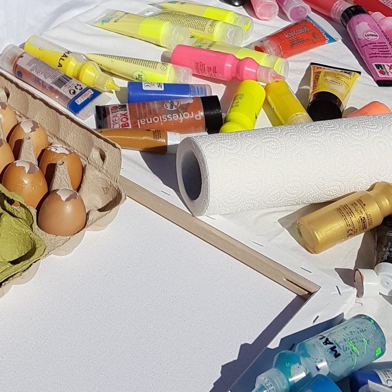 Für die Eierschlacht brauchst du einige leere Eierschalen, Leinwände oder Leinwandpappen und viel bunte Farbe (z.B. Acrylfarben, Fingerfarben, Schulmalfarben ...)