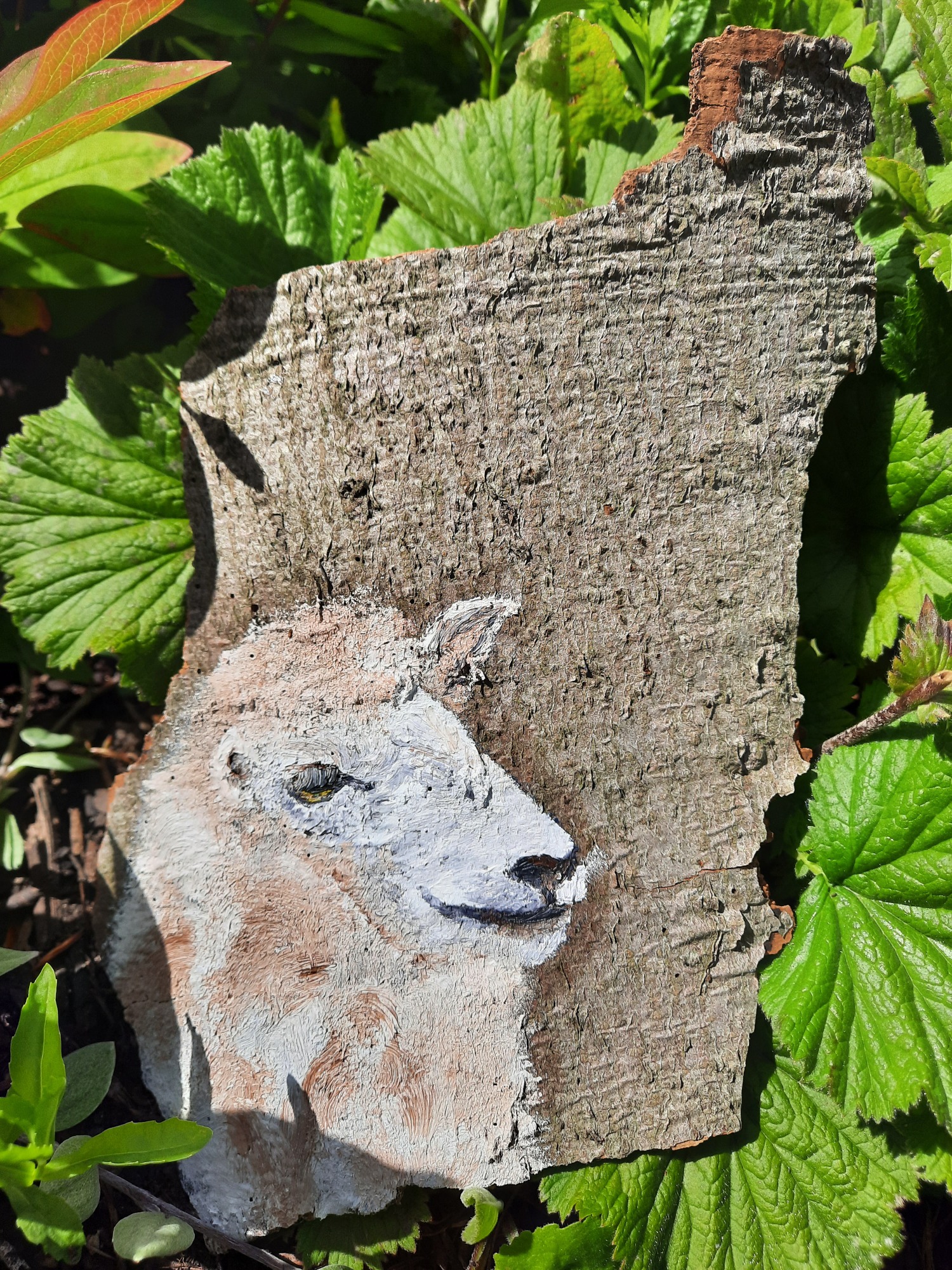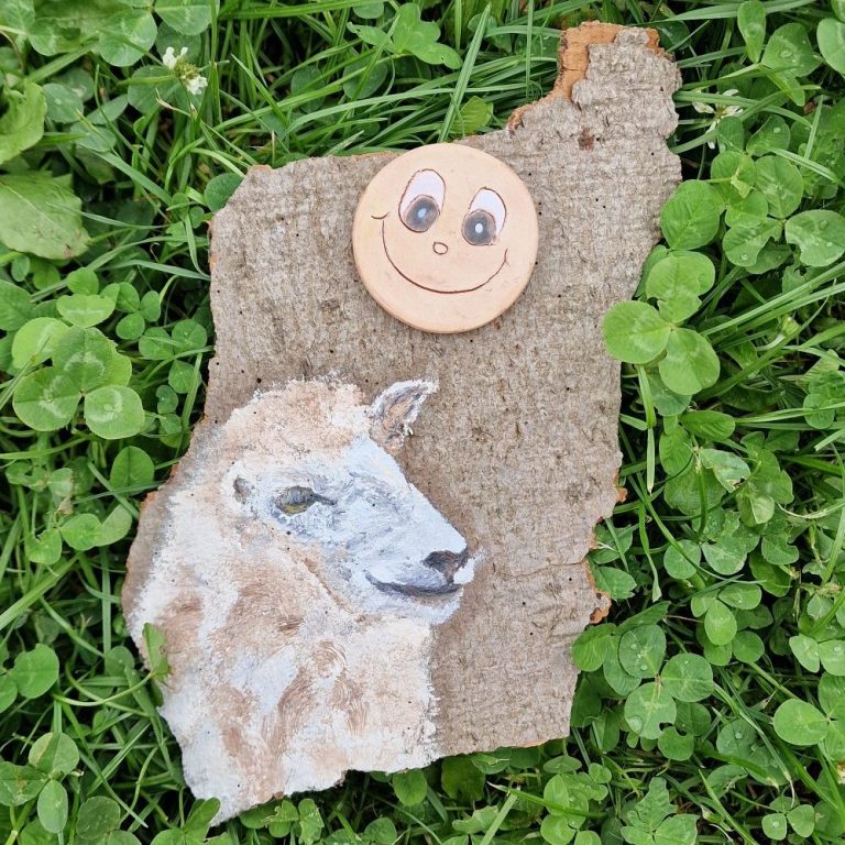 Eine Baumrinde wurde mit einem detailreichen Schaf in Ölfarbe bemalt. Jedes Kunstwerk ist ein Unikat und vereint die rauhe Schönheit der Natur mit der Sanftheit eines Schafs. Genieße die kreative Harmonie.