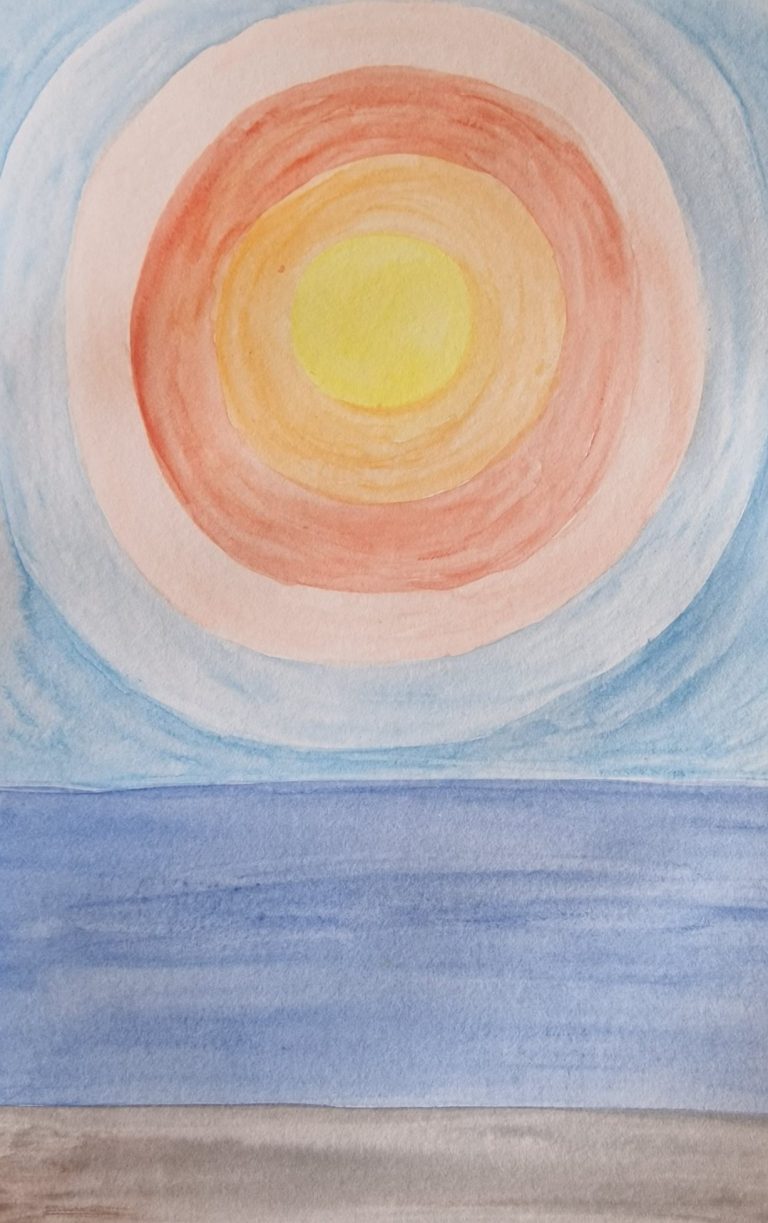 Mit Wassertankpinsel und meinen vielseitigen Aquarell-Buntstiften malte ich einen abstrakten Sonnenuntergang in den Farben, die mir zur Verfügung standen.