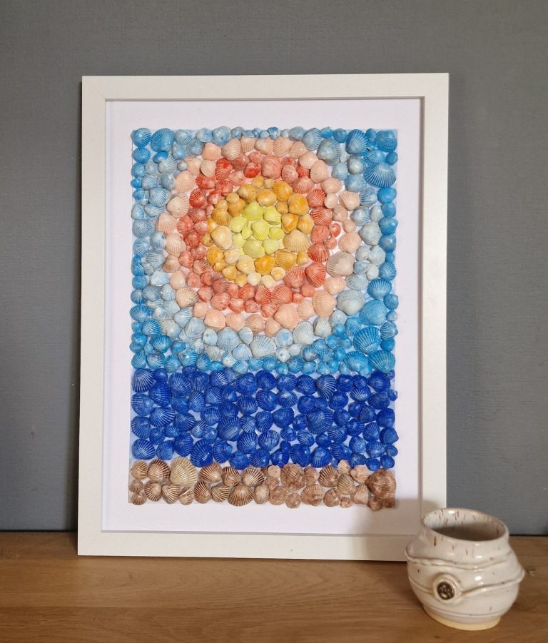 Inspiriert von einem Sonnenuntergang auf Hiddensee entstand dieses Muschelbild – direkt am Meer, beim Strandspaziergang gesammelt.