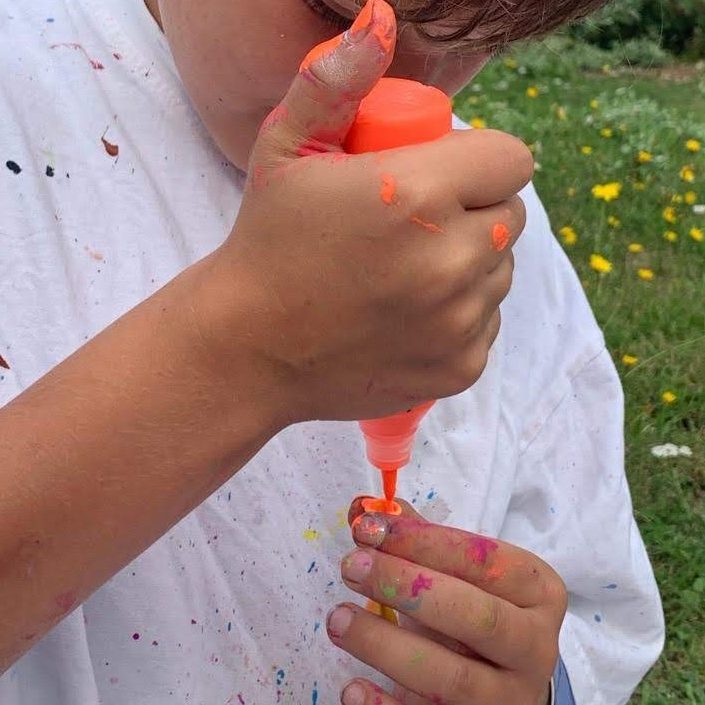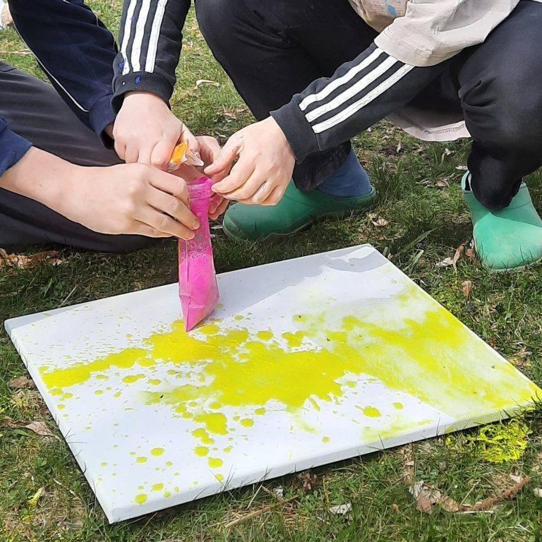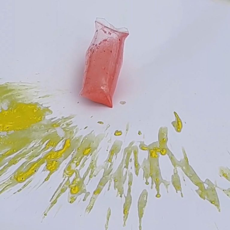 Fülle die Beutel mit je einer Farbe und einem guten Schluck Essig. Dann füge Backpulver hinzu. Verschließe den Beutel schnell und lege ihn auf ein Blatt Papier oder eine Leinwand.
