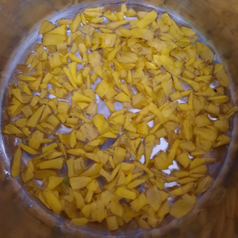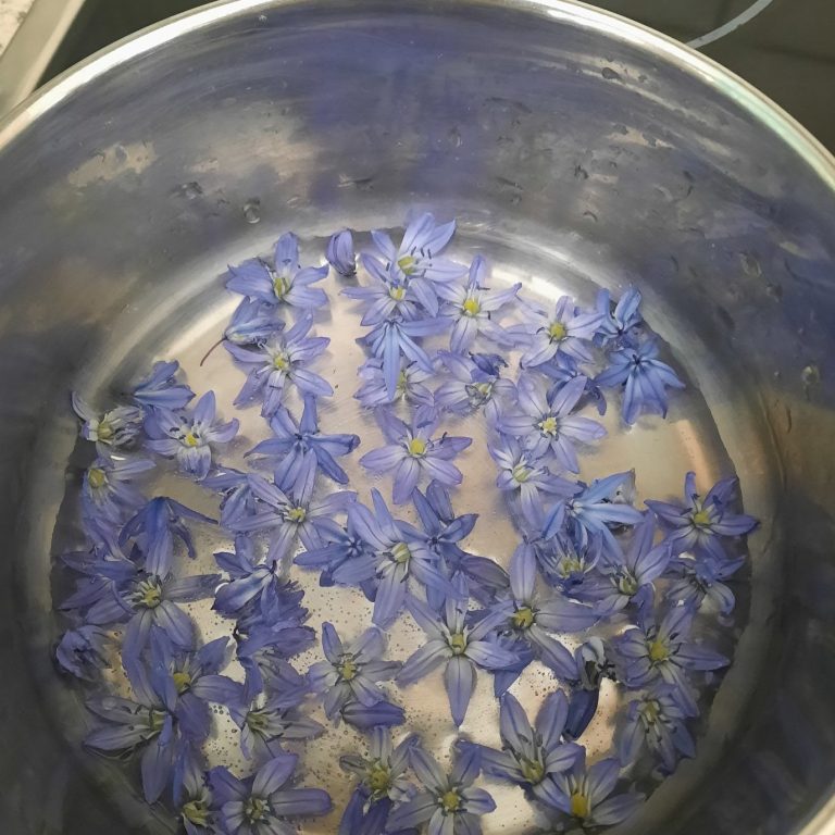 Diese Blüten und Blätter werden dann mit ganz wenig Wasser gekocht, bis sich die Farbe aus ihnen löst.