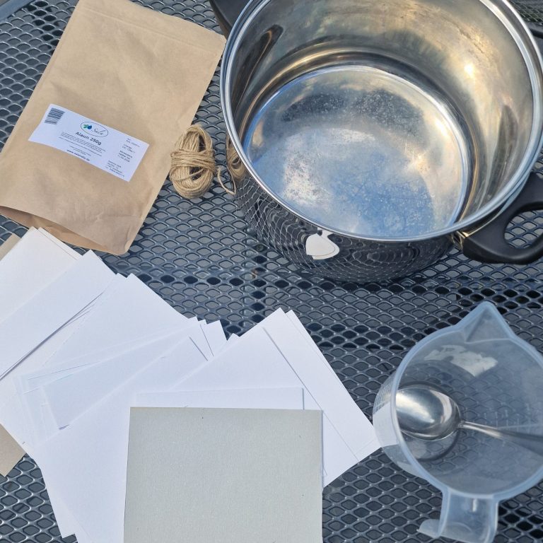 Du brauchst schöne Blätter und Blüten, Papier (z.B. Aquarellpapier), Pappe, Band, Alaunsalz, warmes Wasser, einen großen Topf und Geduld.