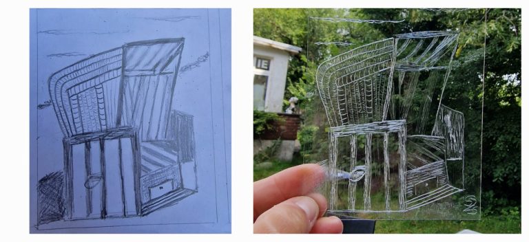 Mit einer Nadel oder einem anderen spitzen Werkzeug wird das Motiv sorgfältig in das Plexiglas eingeritzt.