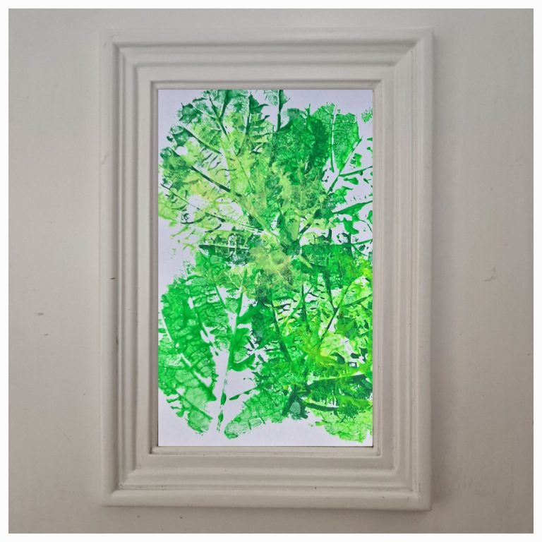 Die gesammelten Blätter werden auf der Rückseite mit Acrylfarbe bestrichen. Dann werden sie vorsichtig auf ein Blatt Papier gedruckt. Der Druckprozess beginnt mit dunkleren Grüntönen im Hintergrund und wird im Vordergrund immer heller. So entsteht ein vielschichtiges und lebendiges Bild, das die natürliche Schönheit der Blätter zur Geltung bringt.
