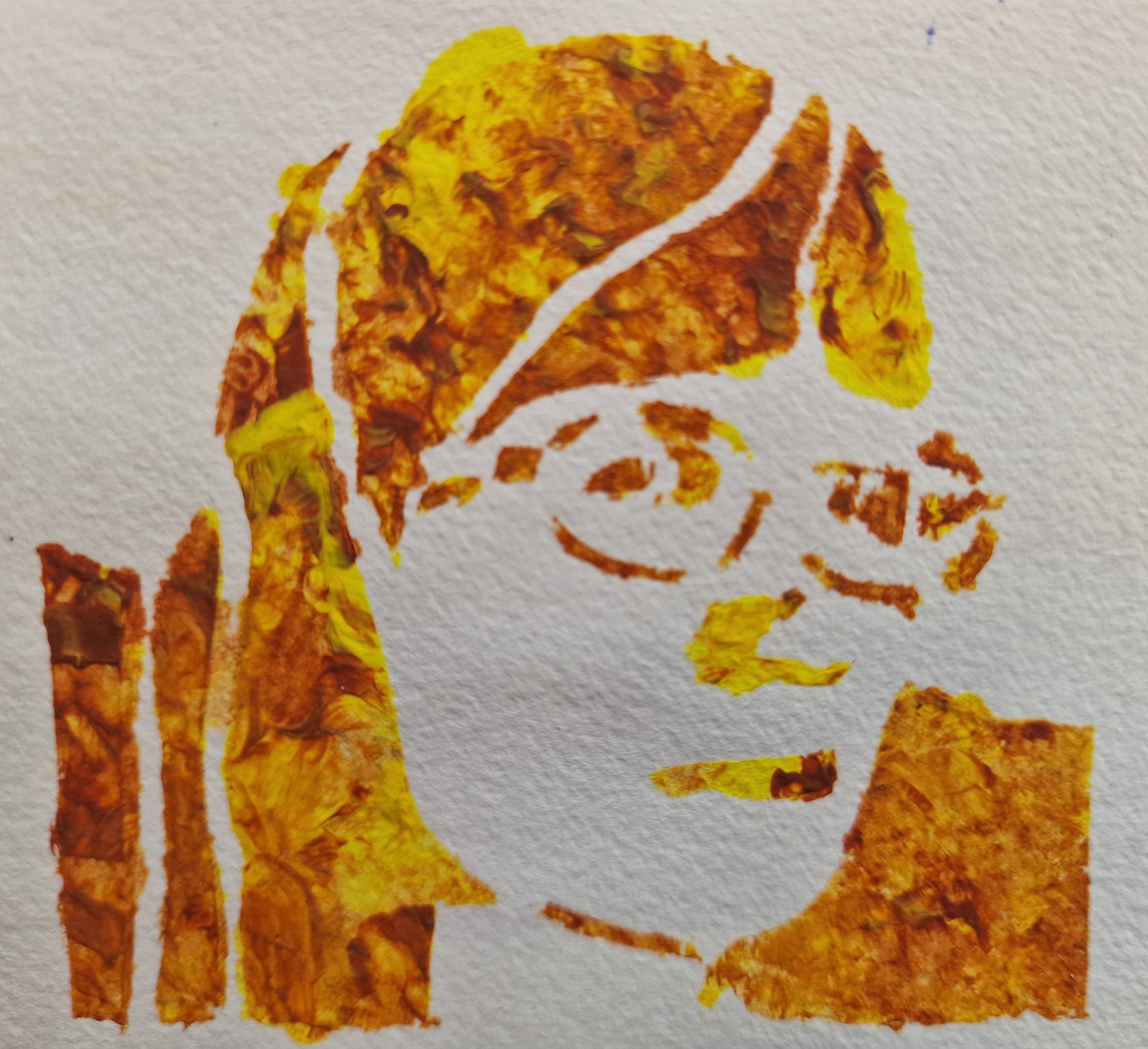 Lege dann die Schablone auf das Papier, das du bedrucken möchtest. Nimm ein zerknülltes Stück Küchenrolle, tauche es in die gewünschte Farbe und tupfe es vorsichtig über die Schablone.