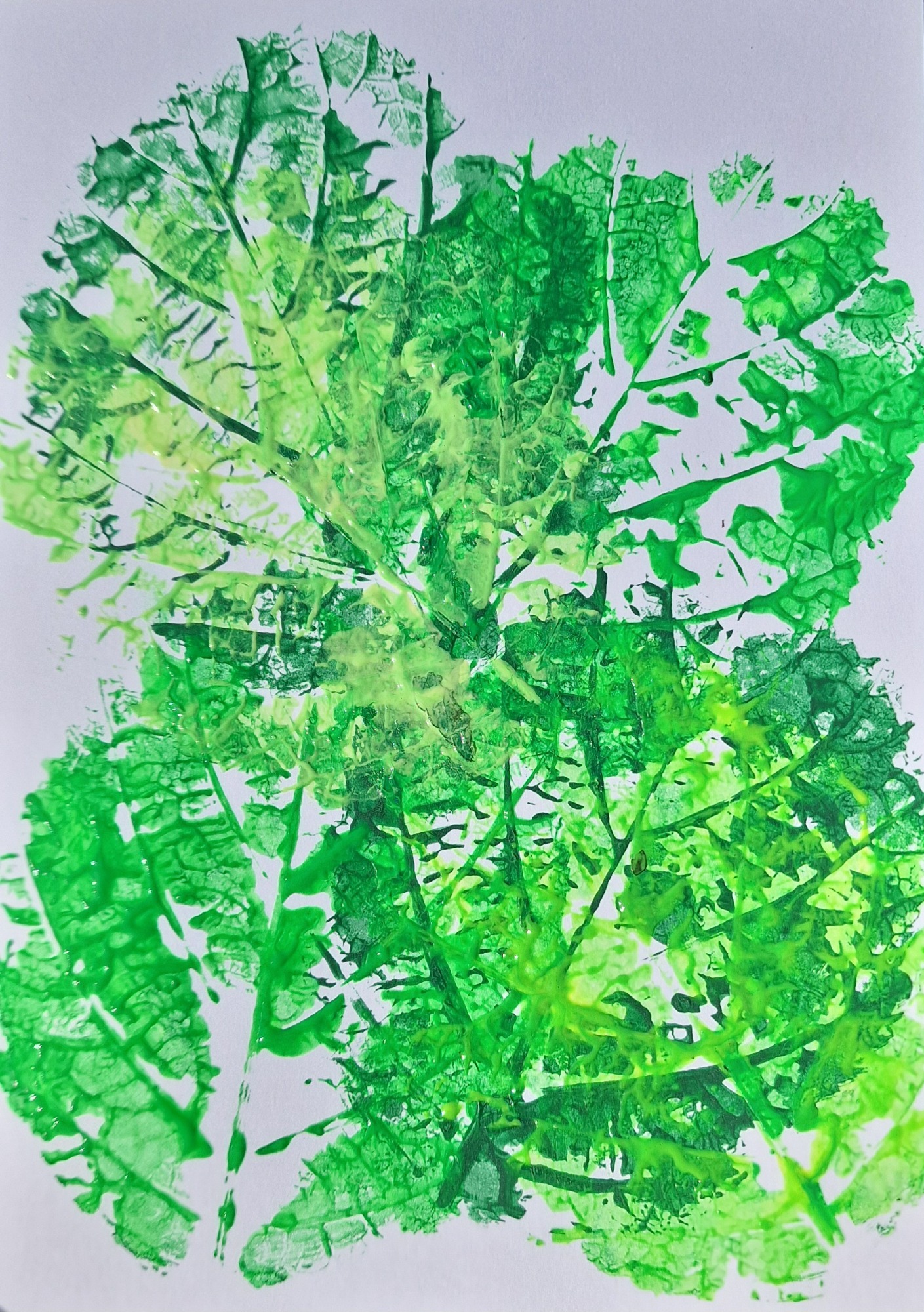 Die gesammelten Blätter werden auf der Rückseite mit Acrylfarbe bestrichen. Dann werden sie vorsichtig auf ein Blatt Papier gedruckt. Der Druckprozess beginnt mit dunkleren Grüntönen im Hintergrund und wird im Vordergrund immer heller. So entsteht ein vielschichtiges und lebendiges Bild, das die natürliche Schönheit der Blätter zur Geltung bringt.