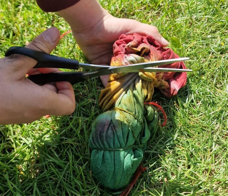 Dann schneidet man die Bänder vorsichtig auf und entfaltet das T-Shirt, um das fertige Muster zu enthüllen. Durch die Kombination aus Verknoten und Einfärben entstehen beeindruckende Muster, die jedes T-Shirt zu einem Unikat machen.