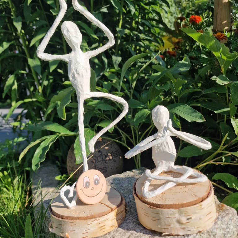 Sobald die Figur trocken ist, kannst du sie nach Belieben anstreichen. Abschließend platzierst du die fertige Figur auf einer Holzscheibe oder einem anderen stabilen Untergrund, um sie ansprechend zu präsentieren. Und schon ist deine individuelle Pappmaché-Skulptur fertig.