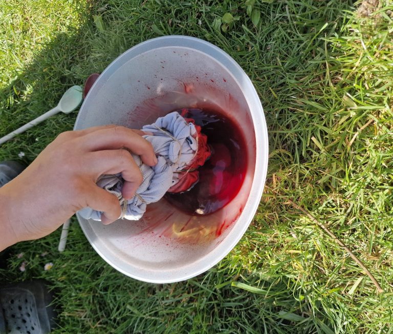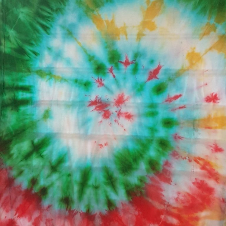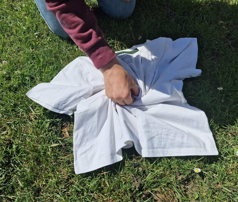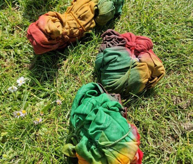 Die Herstellung ist einfach und macht Spaß: Ein weißes Shirt wird verdreht und mit Bändern festgeschnürt. Dieser Schritt ist entscheidend, denn durch das Verdrehte und die festen Knoten entstehen später die charakteristischen Muster. Das Shirt wird stückweise in verschiedene Textilfarben getaucht. Ich habe hier grün, gelb und rot verwendet.