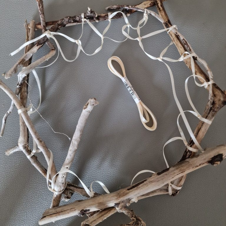 Der Bau des Traumfängers beginnt mit dem Strandholz, das vom Meer schön rund geschliffen sein sollte. Diese Stöcke werden zu einem möglichst runden Kreis zusammengeklebt. Das kann eine Herausforderung sein, da der Kreis stabil und gleichmäßig sein muss.