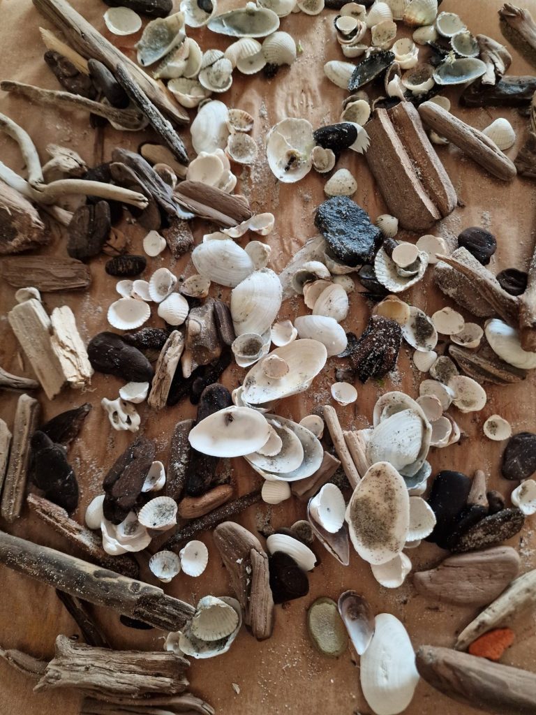 Dabei entsteht ein Sammelsurium aus Strandholz, Muscheln, Federn, Strandgras, kleinen Steinen und Strandglas.