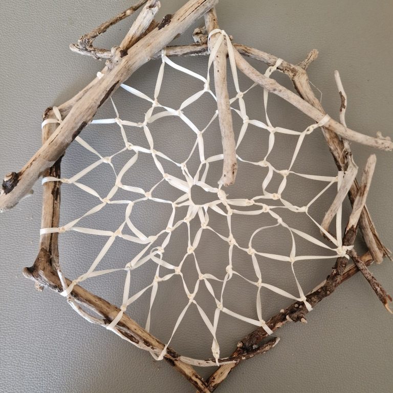 Nach dem Trocknen wird ein Band verwendet, um das Muster des Traumfängers zu weben. In der Mitte bleibt ein kleines Loch frei, damit die guten Träume zu dir gelangen können, während das Netz die bösen Träume abhält.
