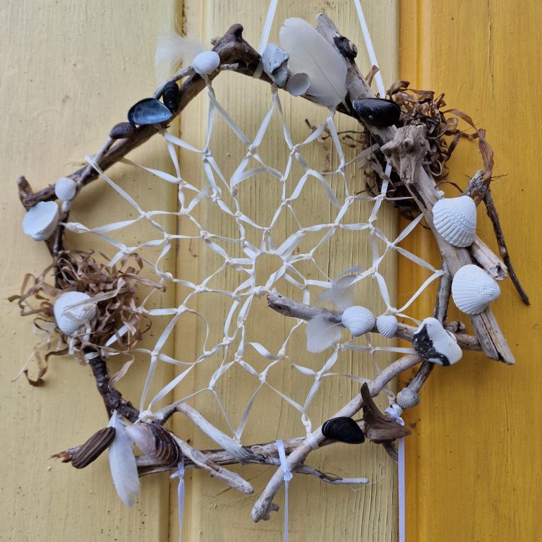 Der letzte Schritt ist das Verzieren des Traumfängers mit den gesammelten Schätzen. Muscheln, Strandgras, hübsche Steine und Strandglas werden kunstvoll arrangiert, um jedem Traumfänger seine individuelle Schönheit zu verleihen.