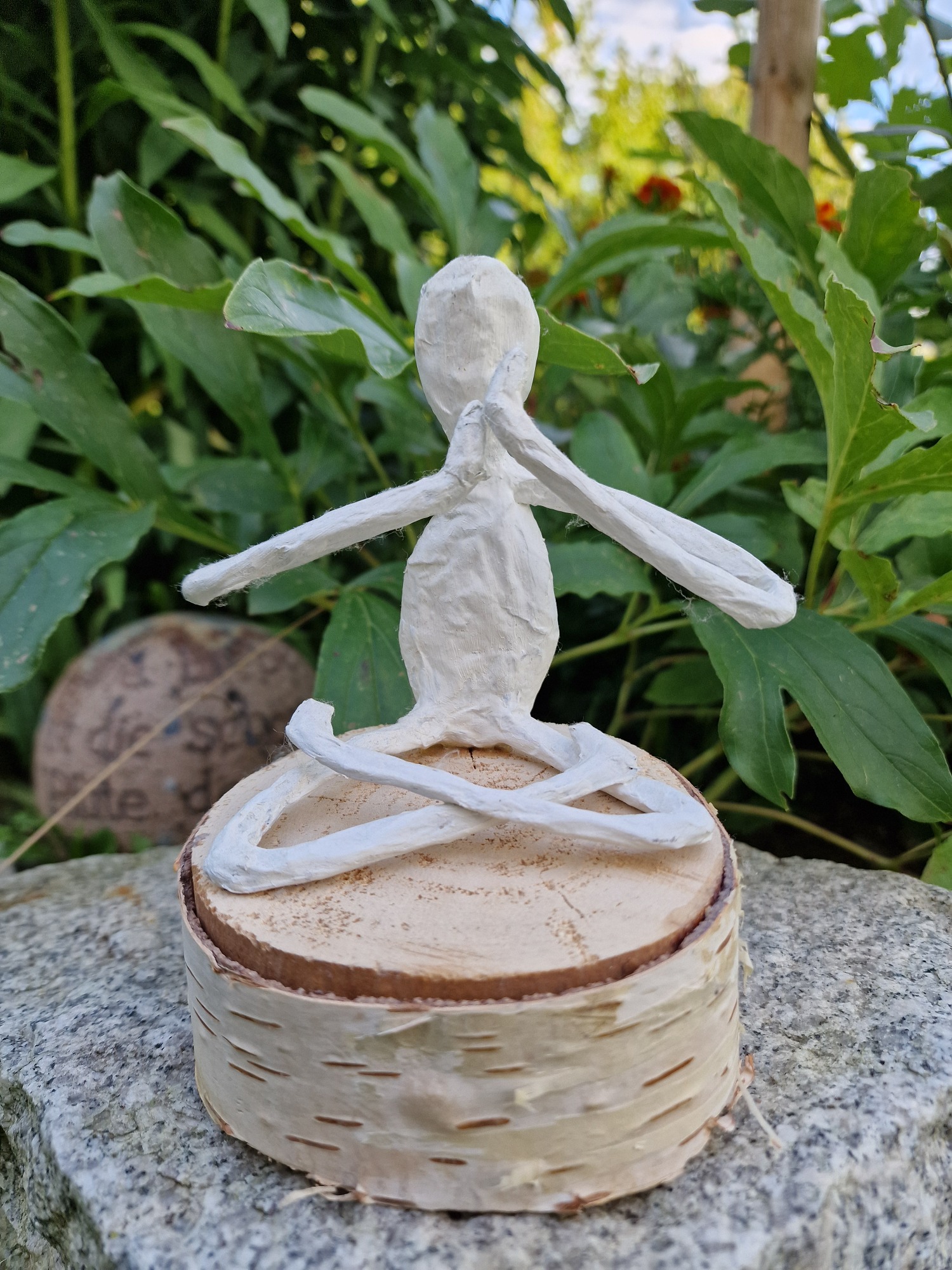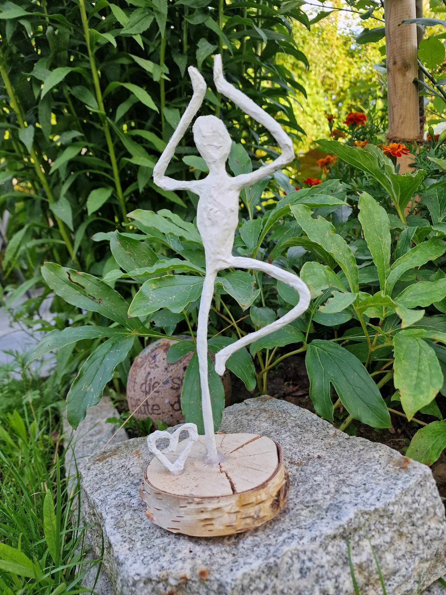 Sobald die Figur trocken ist, kannst du sie nach Belieben anstreichen. Abschließend platzierst du die fertige Figur auf einer Holzscheibe oder einem anderen stabilen Untergrund, um sie ansprechend zu präsentieren. Und schon ist deine individuelle Pappmaché-Skulptur fertig.