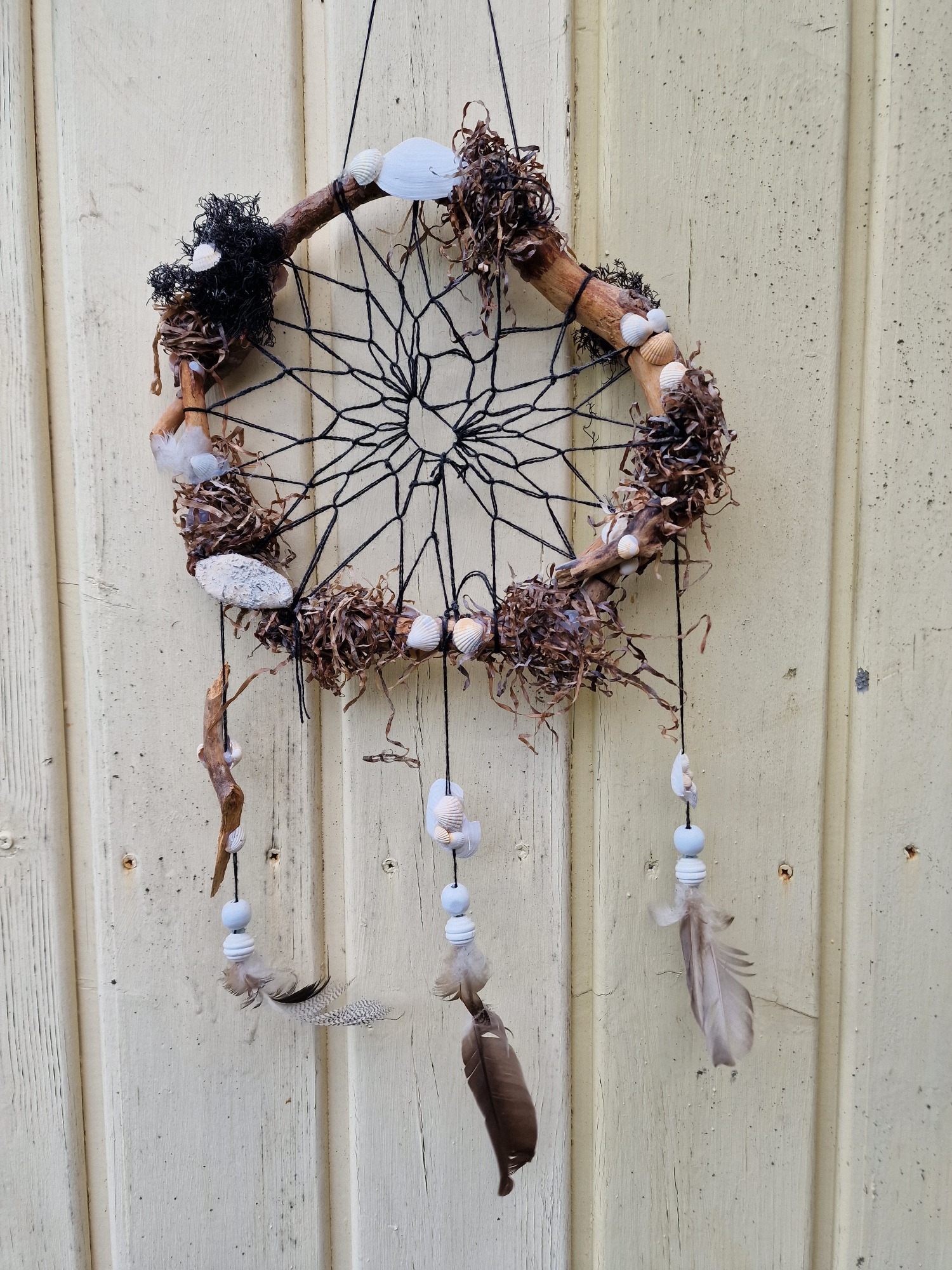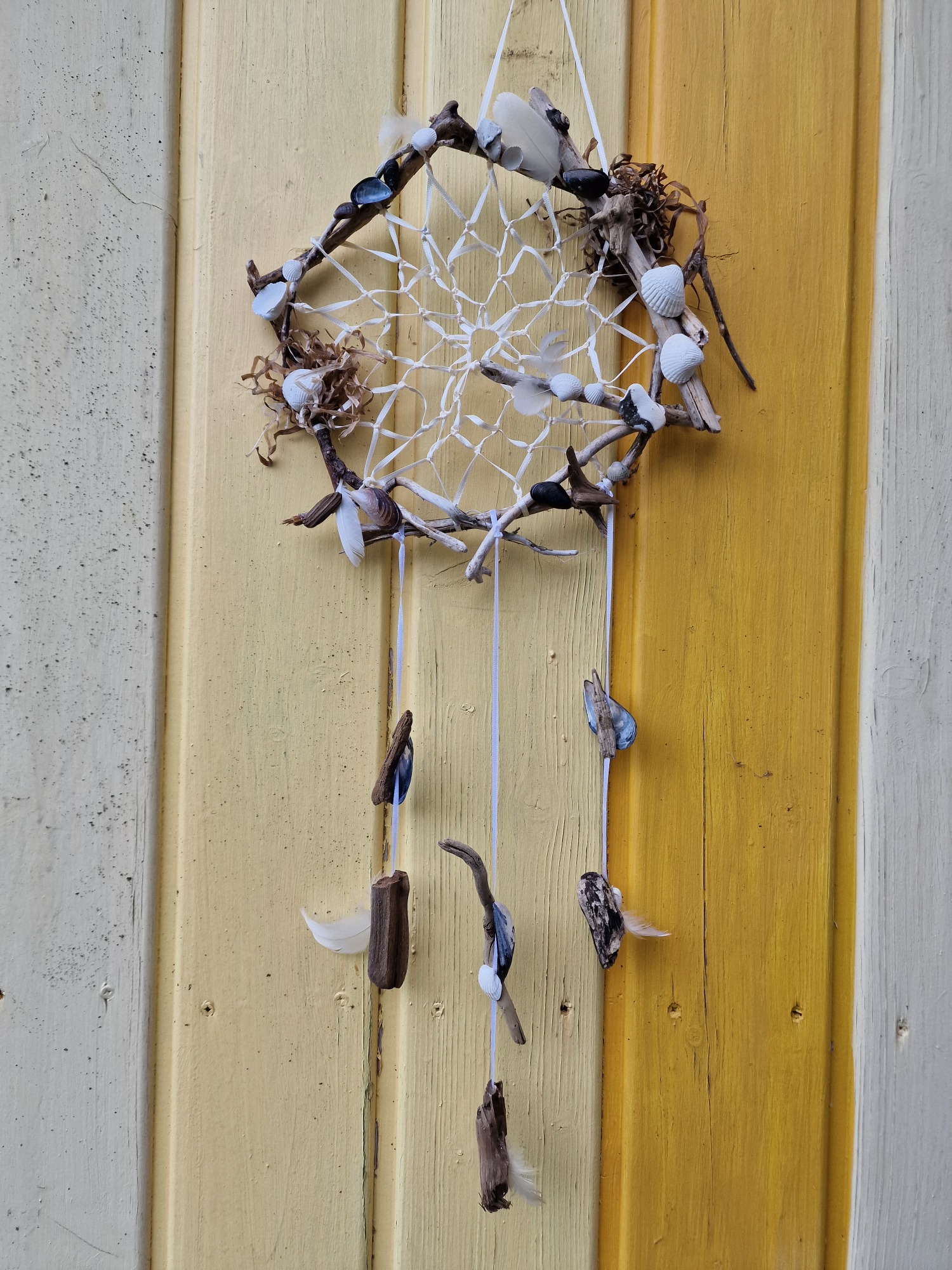 Der letzte Schritt ist das Verzieren des Traumfängers mit den gesammelten Schätzen. Muscheln, Strandgras, hübsche Steine und Strandglas werden kunstvoll arrangiert, um jedem Traumfänger seine individuelle Schönheit zu verleihen.