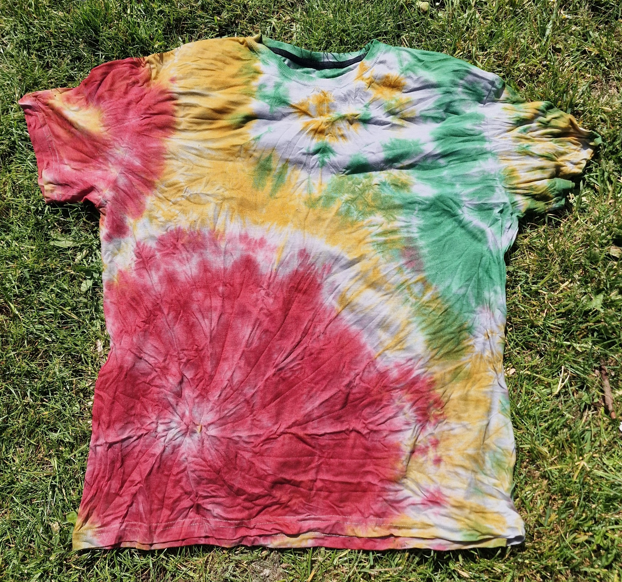 Dann schneidet man die Bänder vorsichtig auf und entfaltet das T-Shirt, um das fertige Muster zu enthüllen. Durch die Kombination aus Verknoten und Einfärben entstehen beeindruckende Muster, die jedes T-Shirt zu einem Unikat machen.