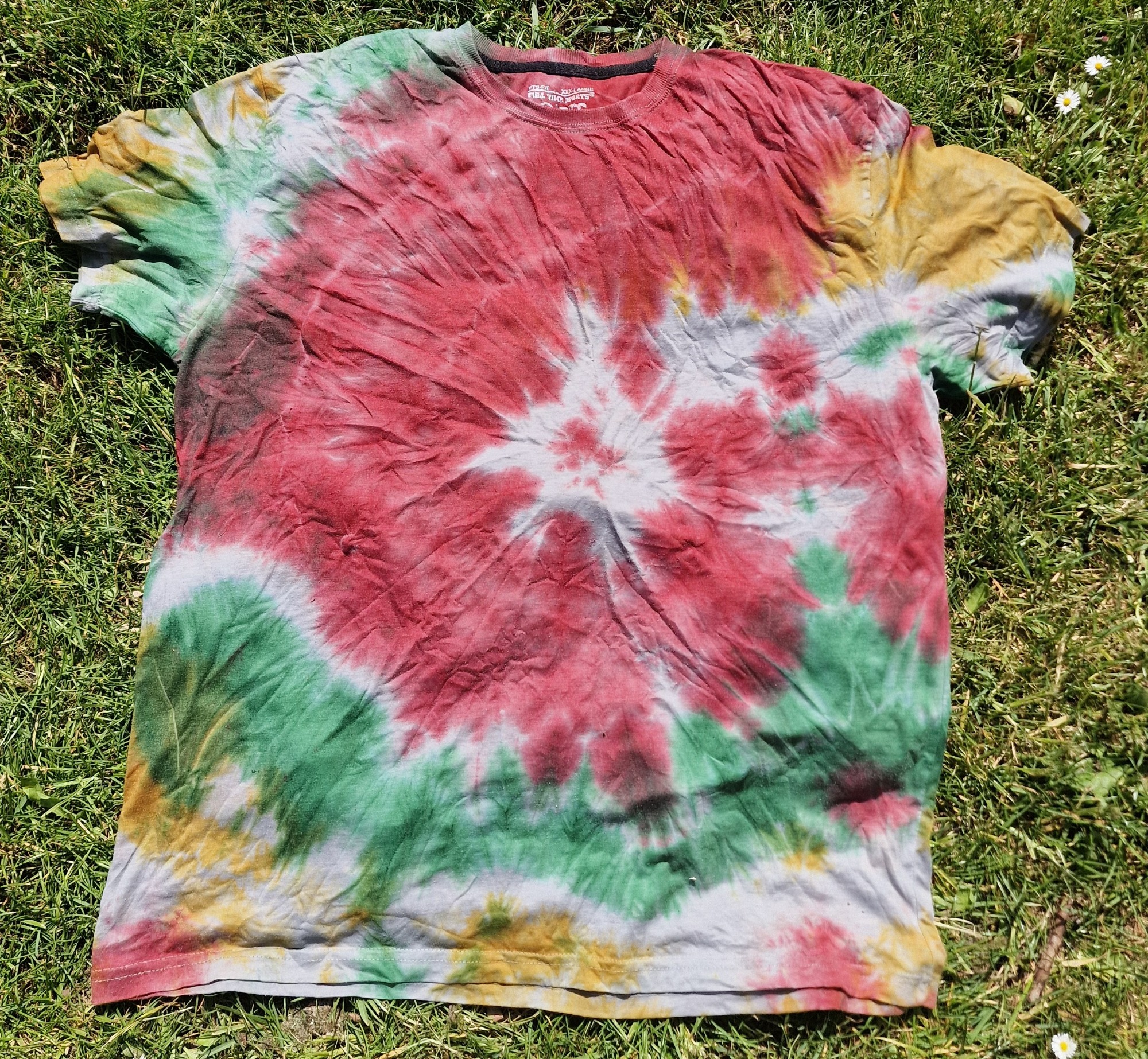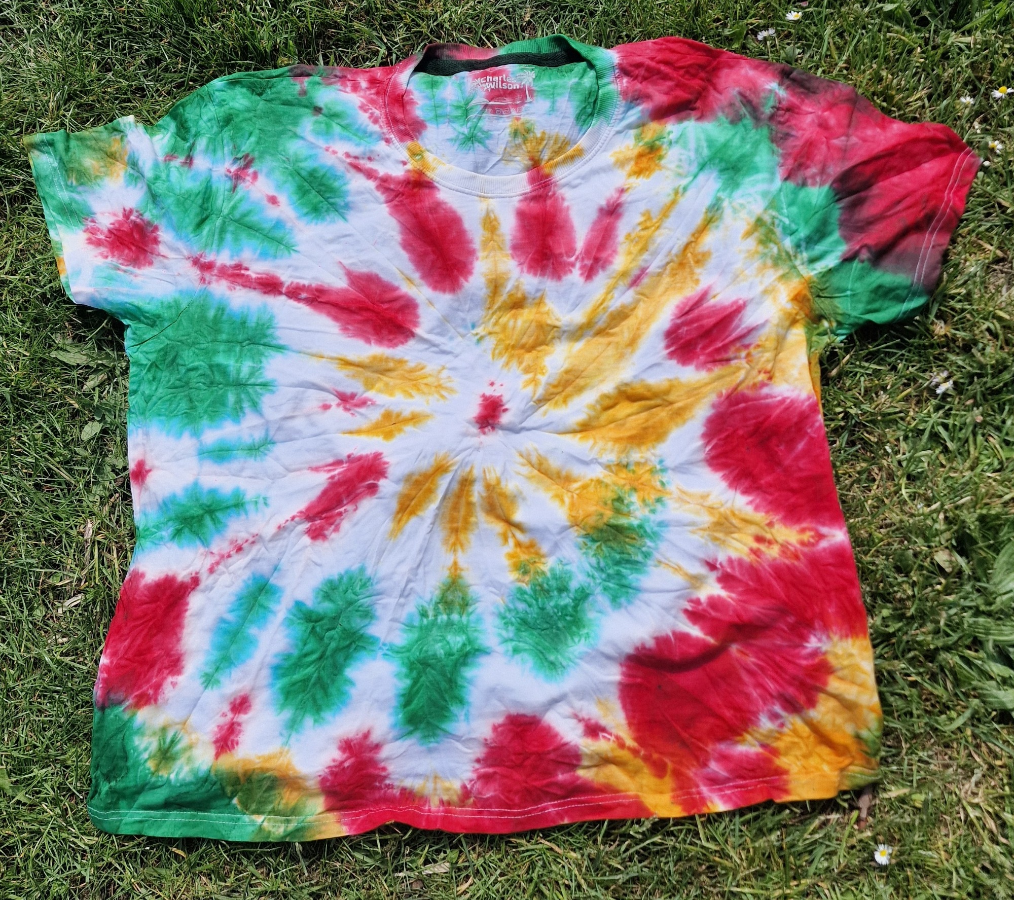 Die Herstellung ist einfach und macht Spaß: Ein weißes Shirt wird verdreht und mit Bändern festgeschnürt. Dieser Schritt ist entscheidend, denn durch das Verdrehte und die festen Knoten entstehen später die charakteristischen Muster. Das Shirt wird stückweise in verschiedene Textilfarben getaucht. Ich habe hier grün, gelb und rot verwendet.