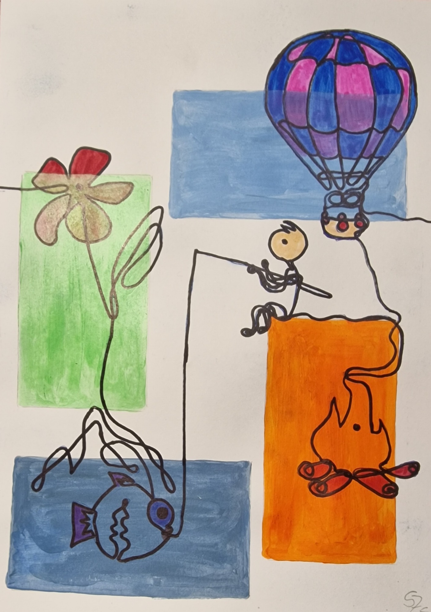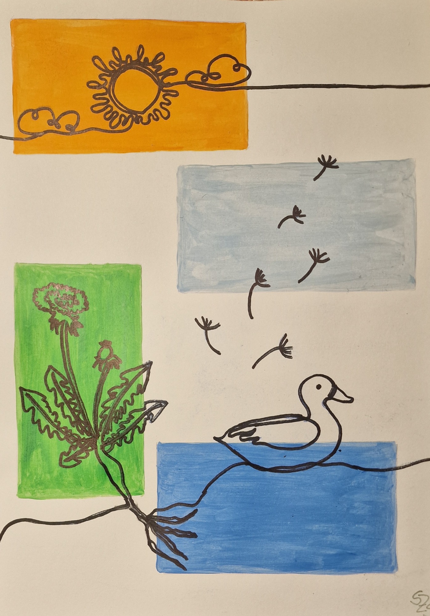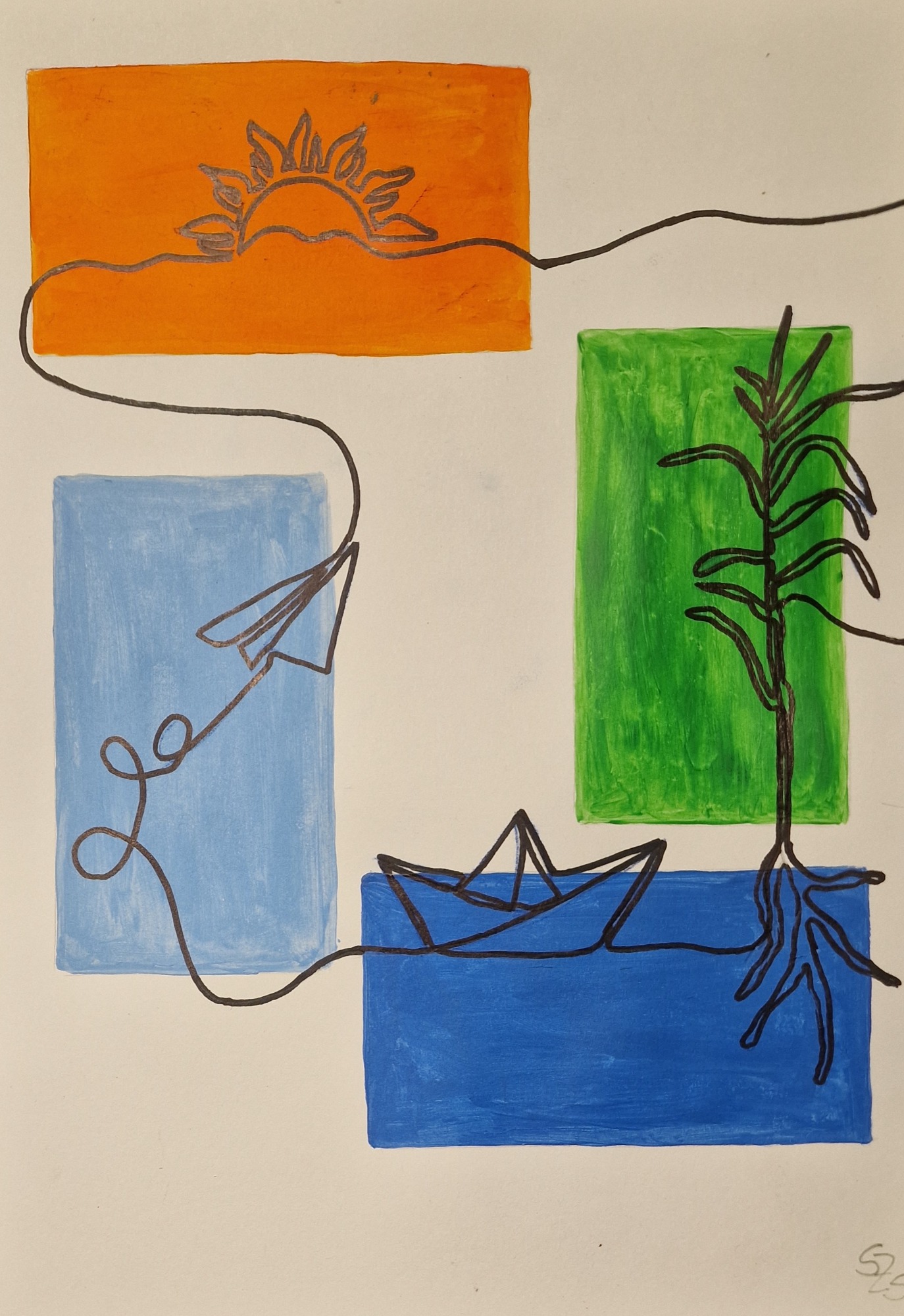 Im Dezember habe ich die 4 Elemente - Luft, Feuer, Wasser und Erde - durch farbige Flächen dargestellt: hellblau für Luft, orange für Feuer, dunkelblau für Wasser und grün für die Erde. In jede Fläche ist ein kleines Motiv gemalt, dass das jeweilige Element symbolisiert. Alle Bilder sind durch eine durchgehende Linie miteinander verbunden, sodass die Elemente nicht isoliert, sondern als Einheit erlebbar werden. Die Serie zeigt, wie Luft, Feuer, Wasser und Erde zusammenwirken und gemeinsam ein harmonisches, lebendiges Ganzes bilden.