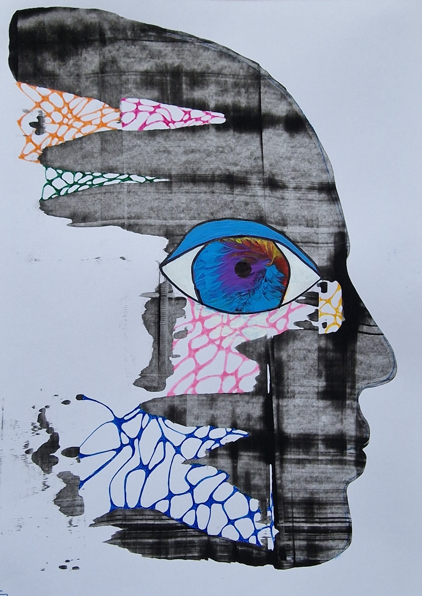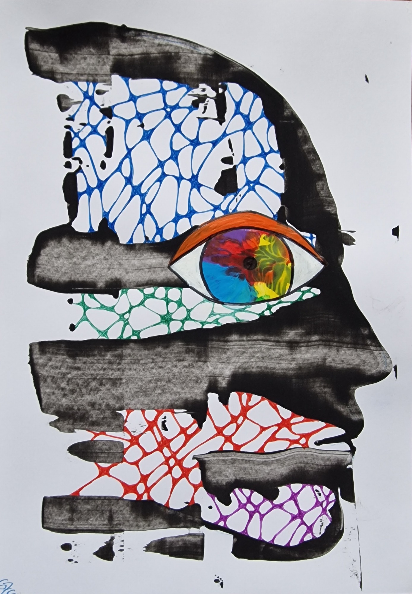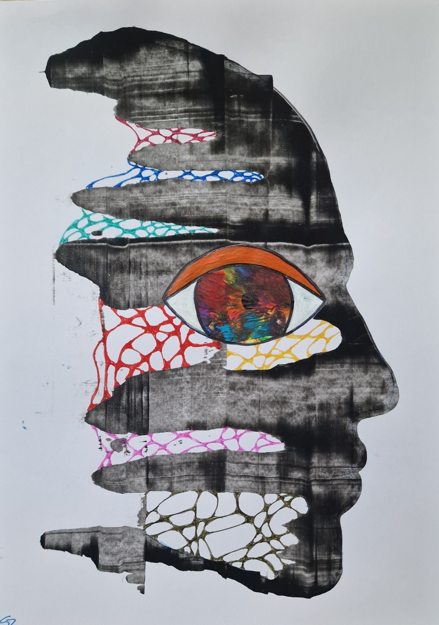 Ein großes, zentrales Auge trägt durch eine Drucktechnik eingebrachte, leuchtende Farben in sich. Es steht für die bunte Welt, die wir wahrnehmen und erleben und für die Vielfalt, die auch in uns selbst liegt.