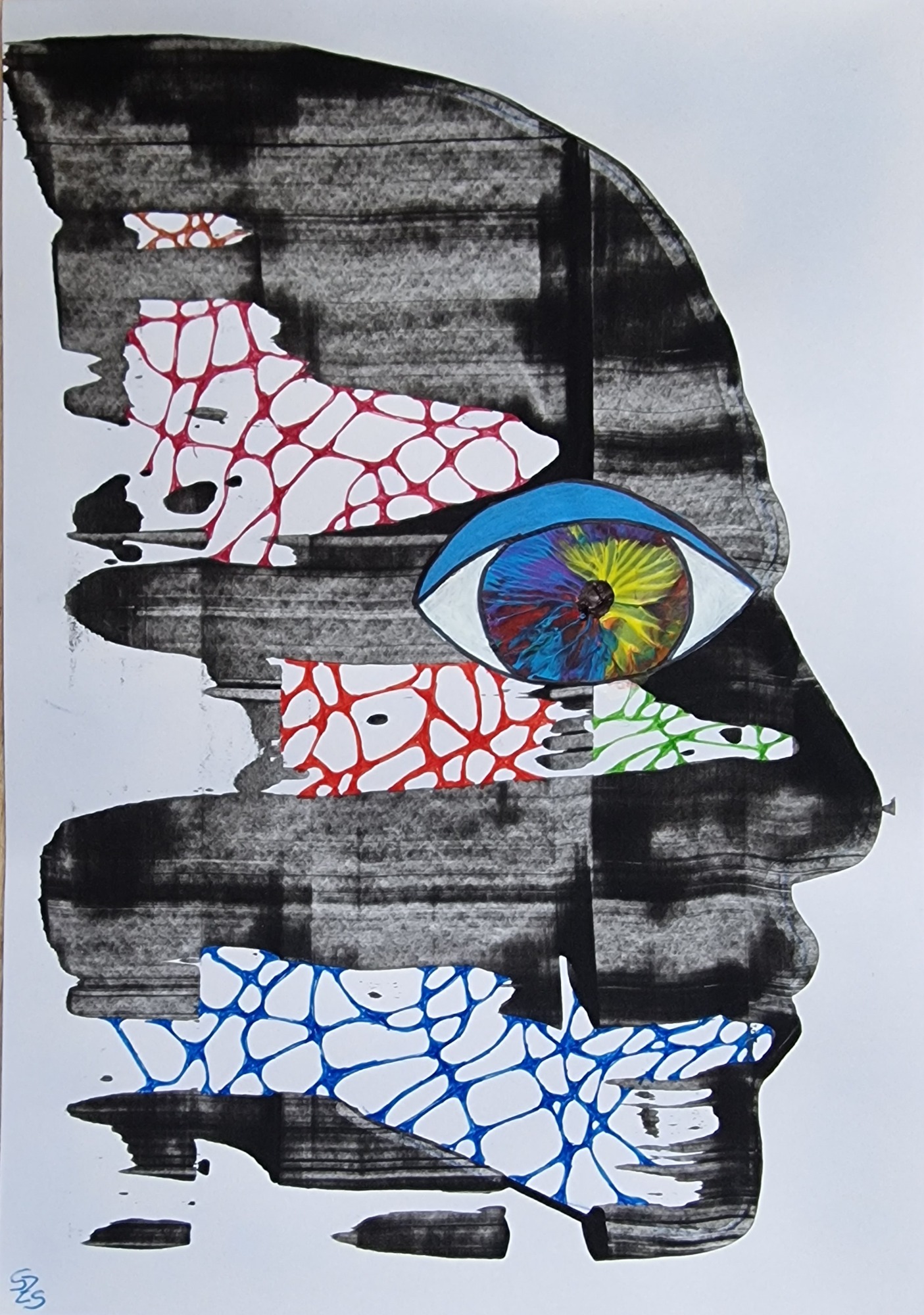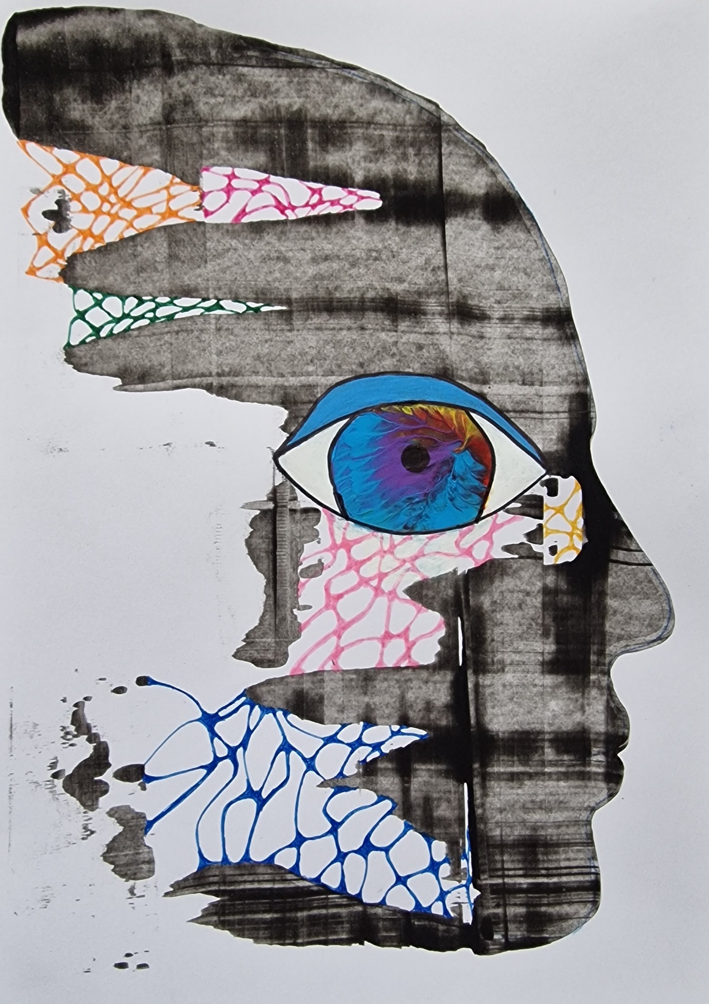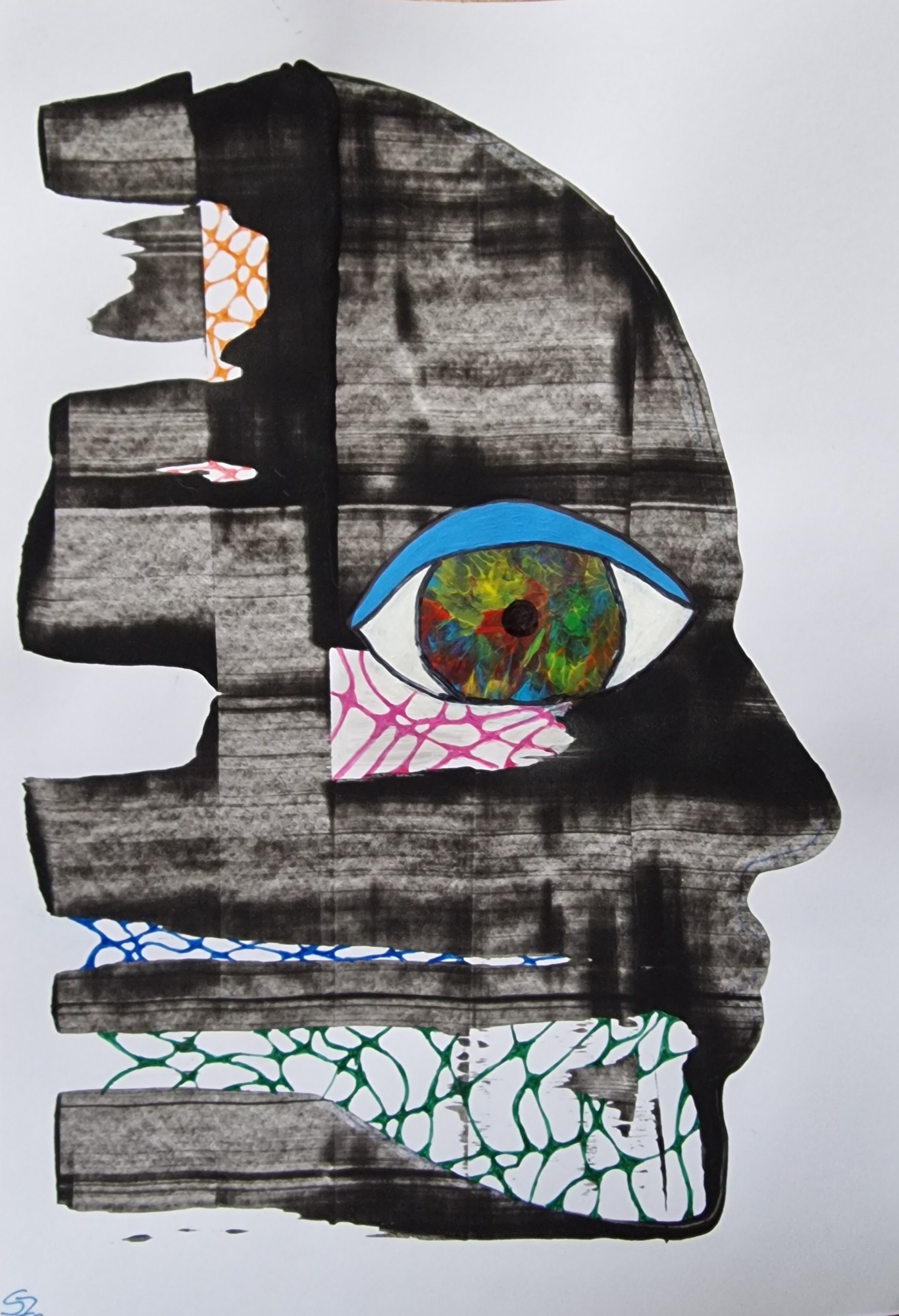 Ein großes, zentrales Auge trägt durch eine Drucktechnik eingebrachte, leuchtende Farben in sich. Es steht für die bunte Welt, die wir wahrnehmen und erleben und für die Vielfalt, die auch in uns selbst liegt.