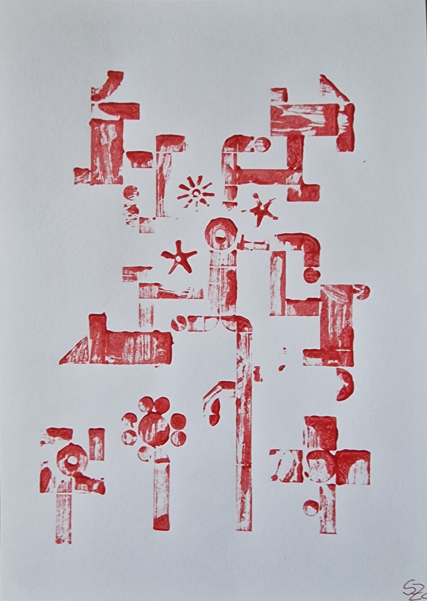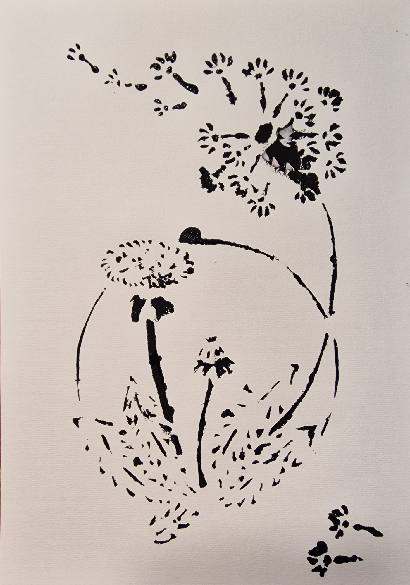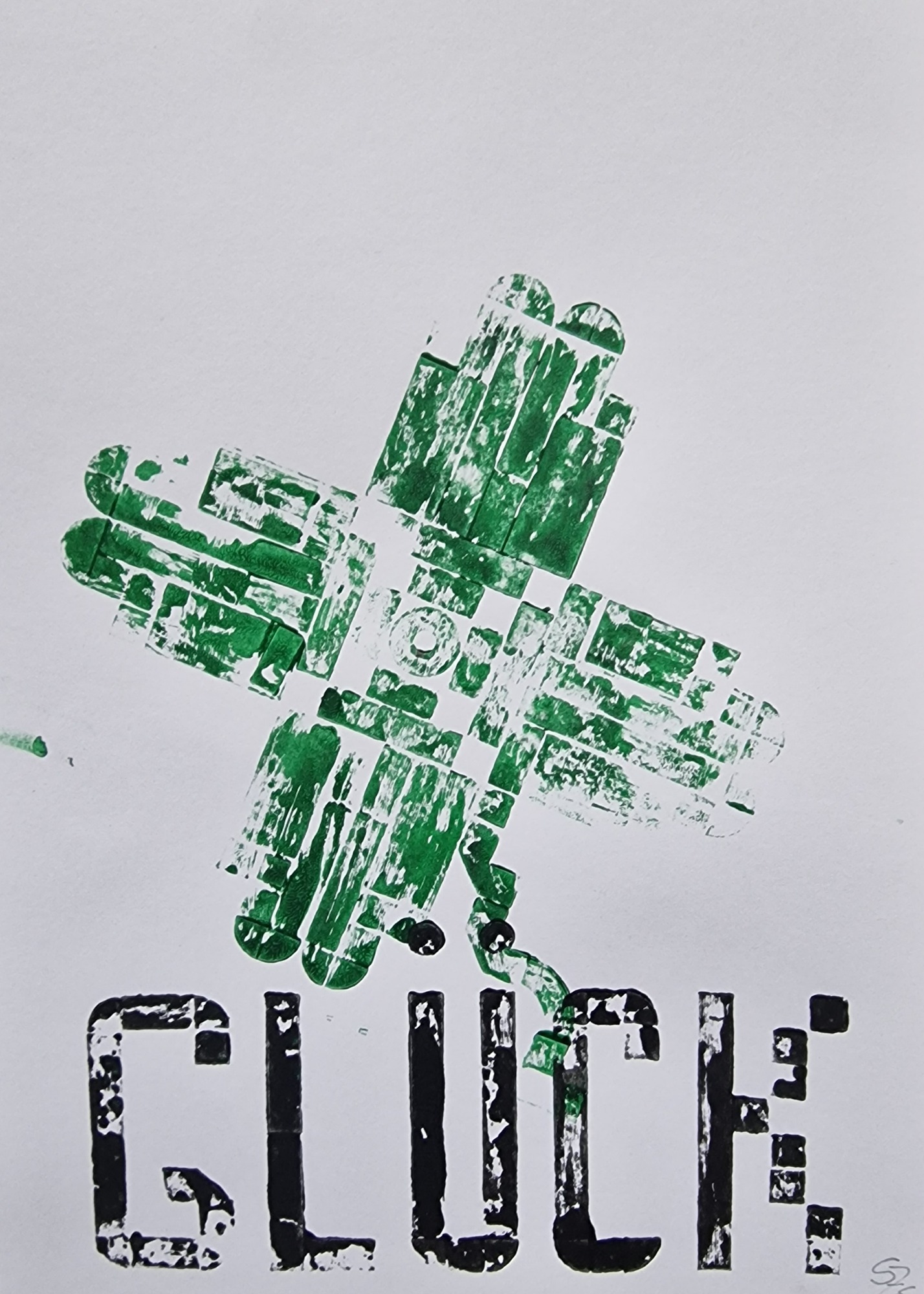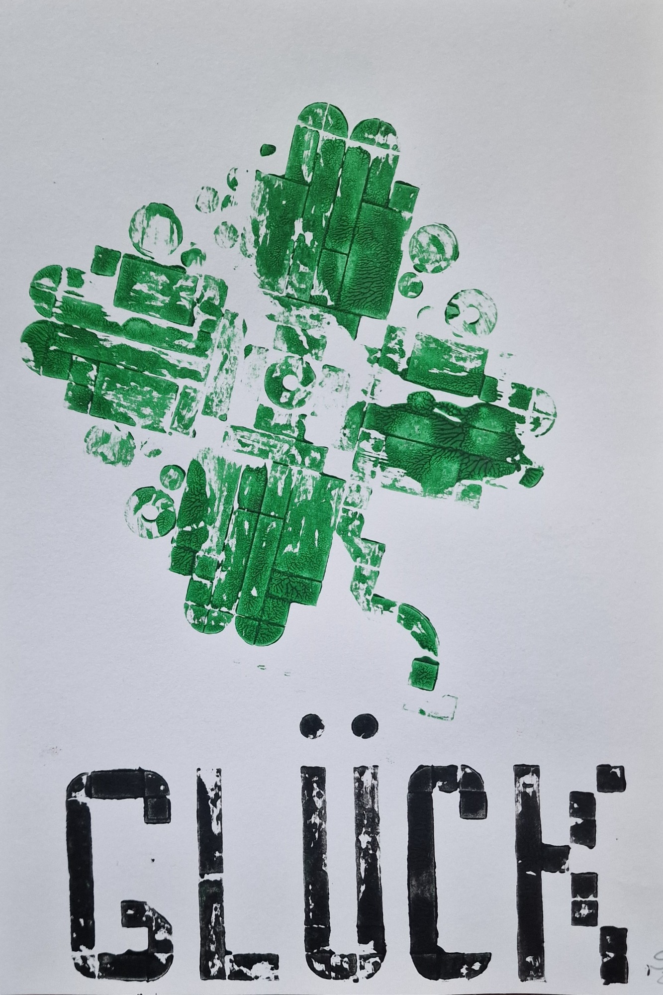 Im Juli steht alles im Zeichen von Klarheit und Neubeginn. In meinem Projekt habe ich mit Lego-Bausteinen ein Kleeblatt und das Wort Glück in Spiegelschrift gelegt - als Symbol für Zuversicht. Durch das Einfärben und Drucken entstand ein lebendiger Abdruck. Dann habe ich auch noch ein abstraktes Blumenmotiv ausprobiert, dass viel Raum für eigene Interpretationen lässt.