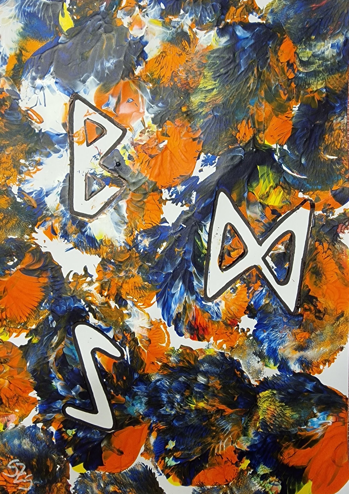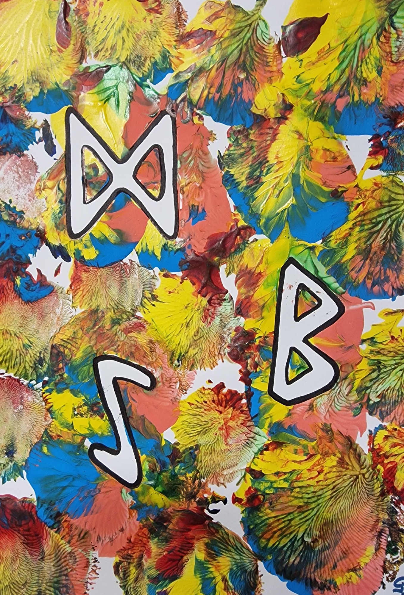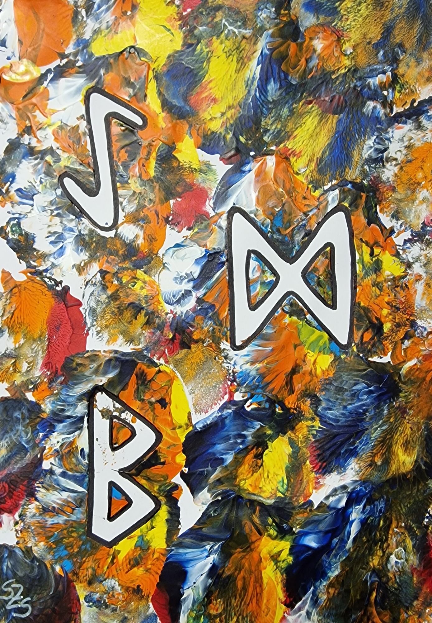 Für das November-Projekt habe ich mit Luftballonabdrücken eine lebendige Mischung aus bunten Farben geschaffen, die sich zufällig zu spannenden Farbkombinationen verbinden. Darin eingebettet sind Runen - alte Symbole, die für Orientierung, Kraft und persönliche Einsicht stehen und aus denen man Inspiration oder Hinweise auf innere Prozesse lesen kann. Durch die Schablonen bleiben die Runen klar und heben sich von der fließenden Farbwelt ab. So treffen Zufall und Struktur aufeinander und schaffen eine harmonische Balance zwischen Bewegung und Sinn.