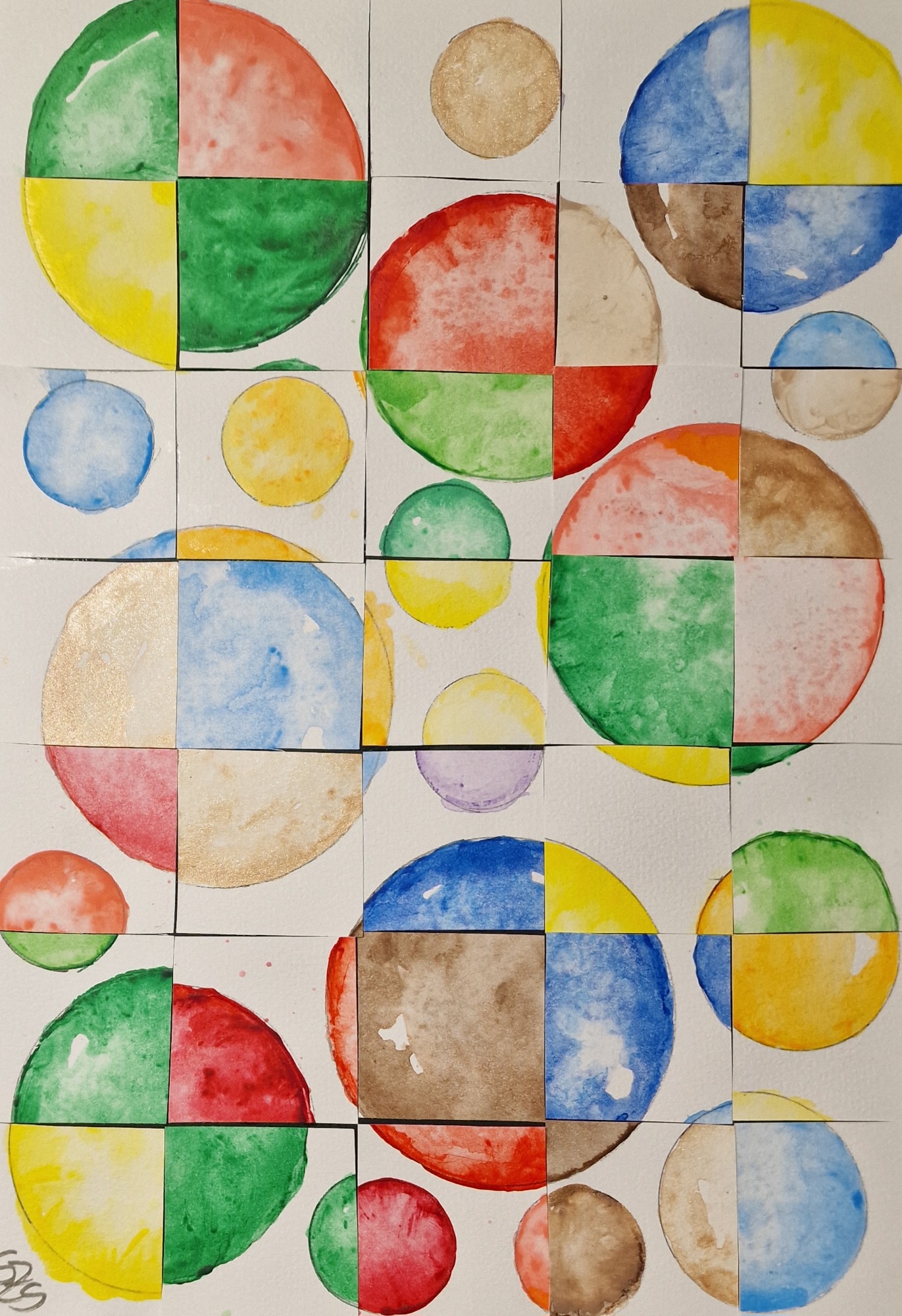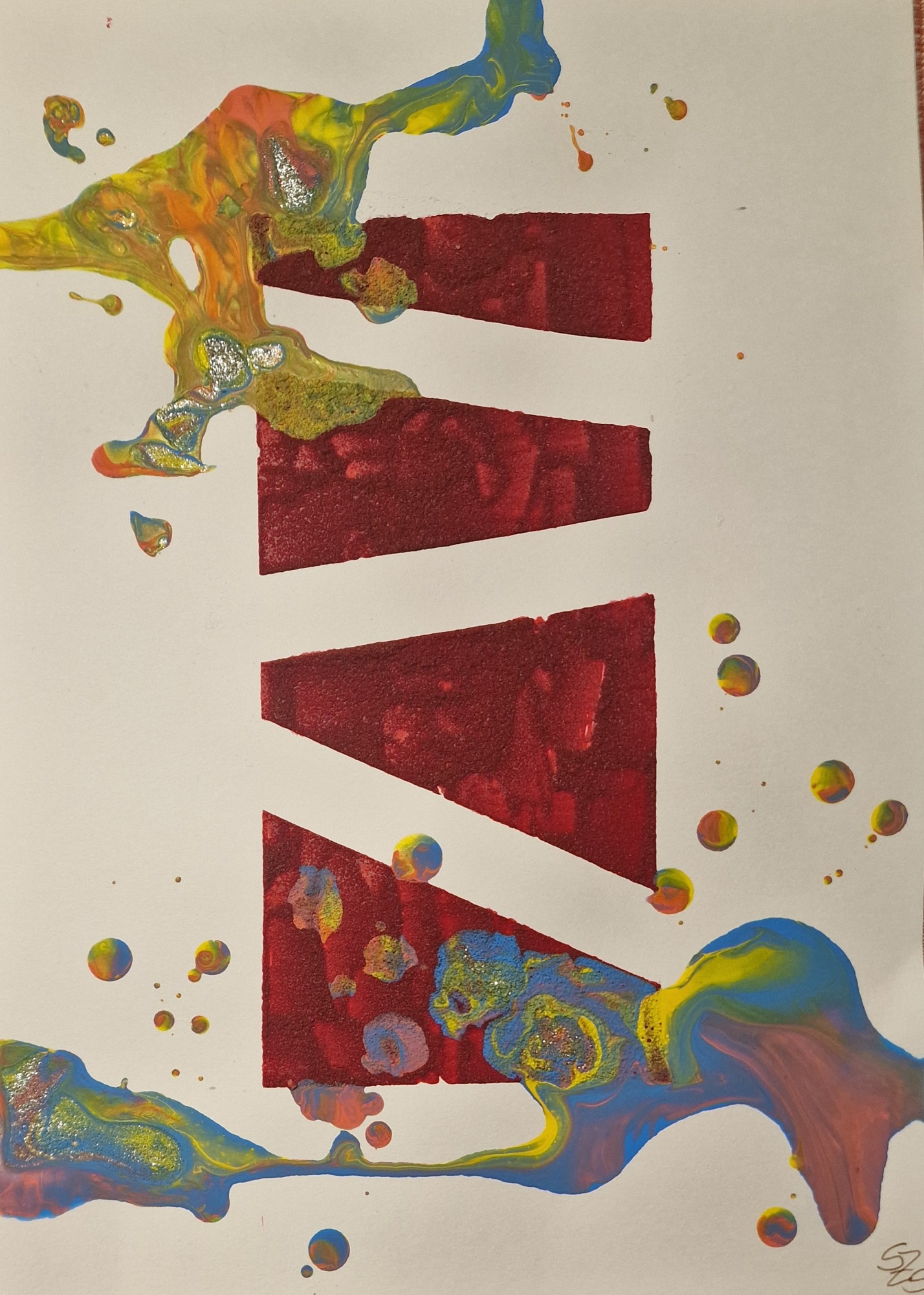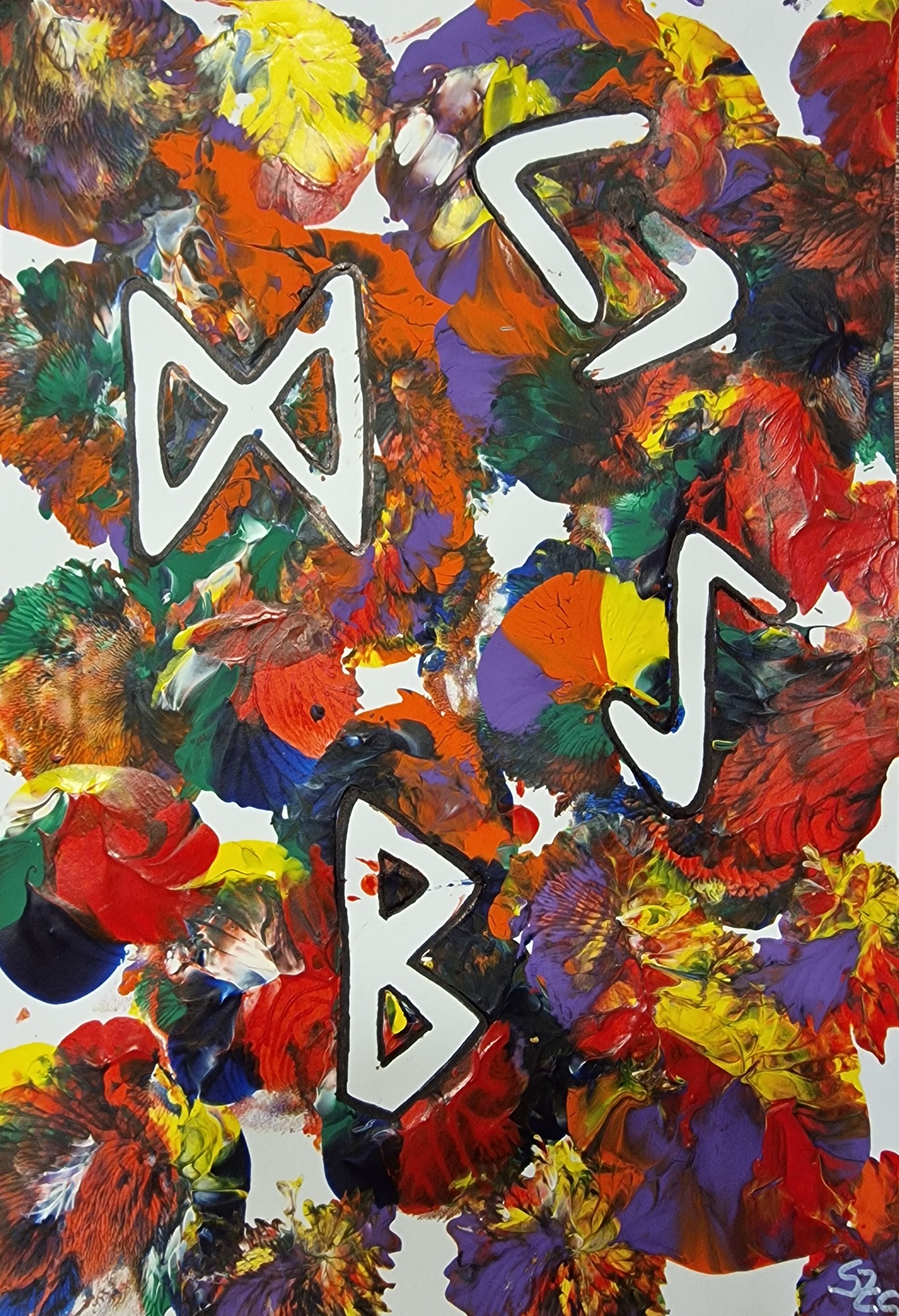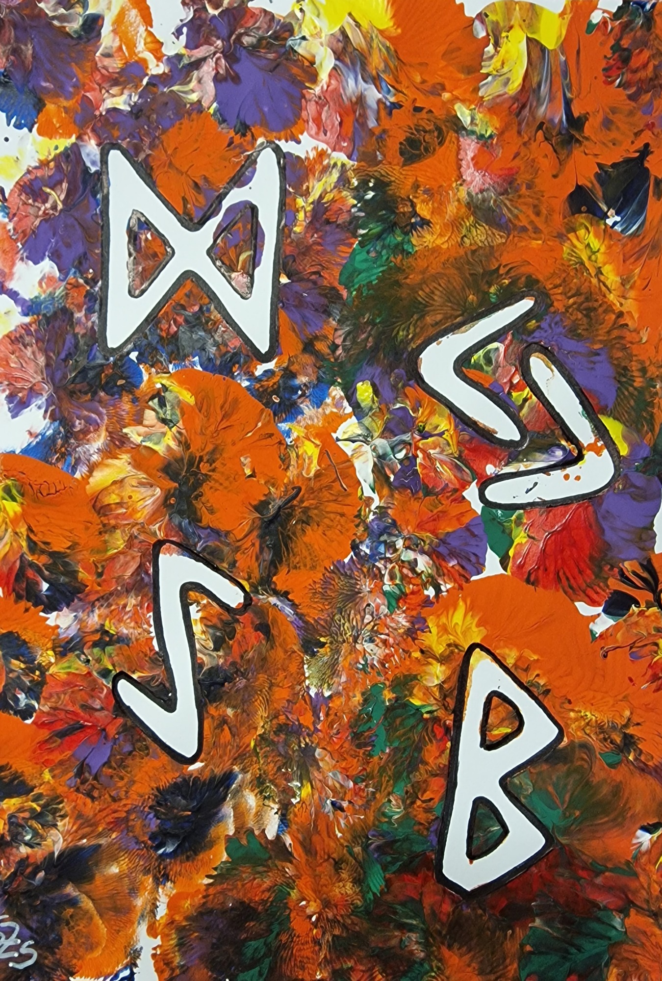 Für das November-Projekt habe ich mit Luftballonabdrücken eine lebendige Mischung aus bunten Farben geschaffen, die sich zufällig zu spannenden Farbkombinationen verbinden. Darin eingebettet sind Runen - alte Symbole, die für Orientierung, Kraft und persönliche Einsicht stehen und aus denen man Inspiration oder Hinweise auf innere Prozesse lesen kann. Durch die Schablonen bleiben die Runen klar und heben sich von der fließenden Farbwelt ab. So treffen Zufall und Struktur aufeinander und schaffen eine harmonische Balance zwischen Bewegung und Sinn.