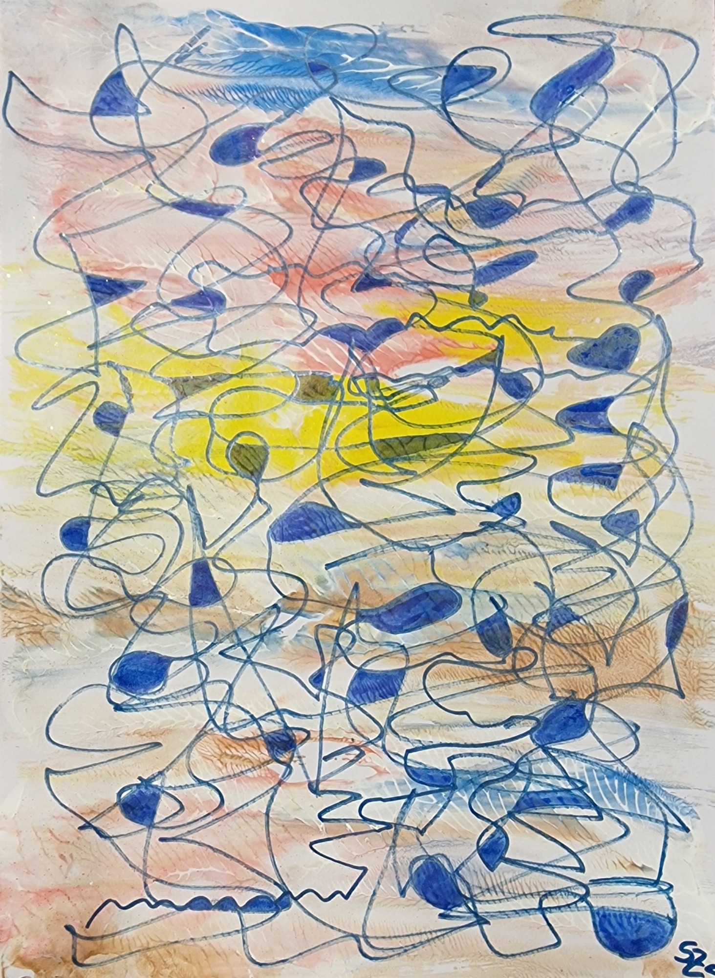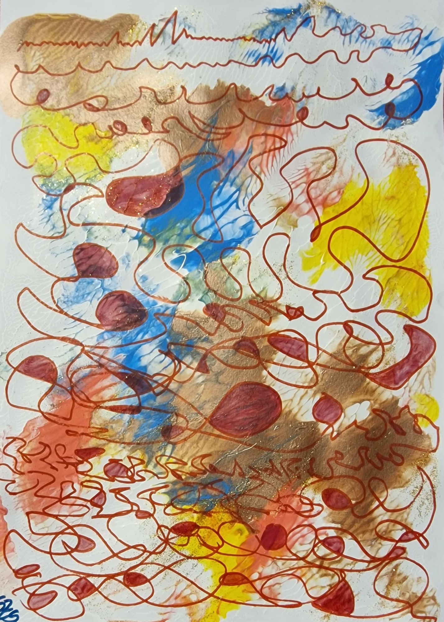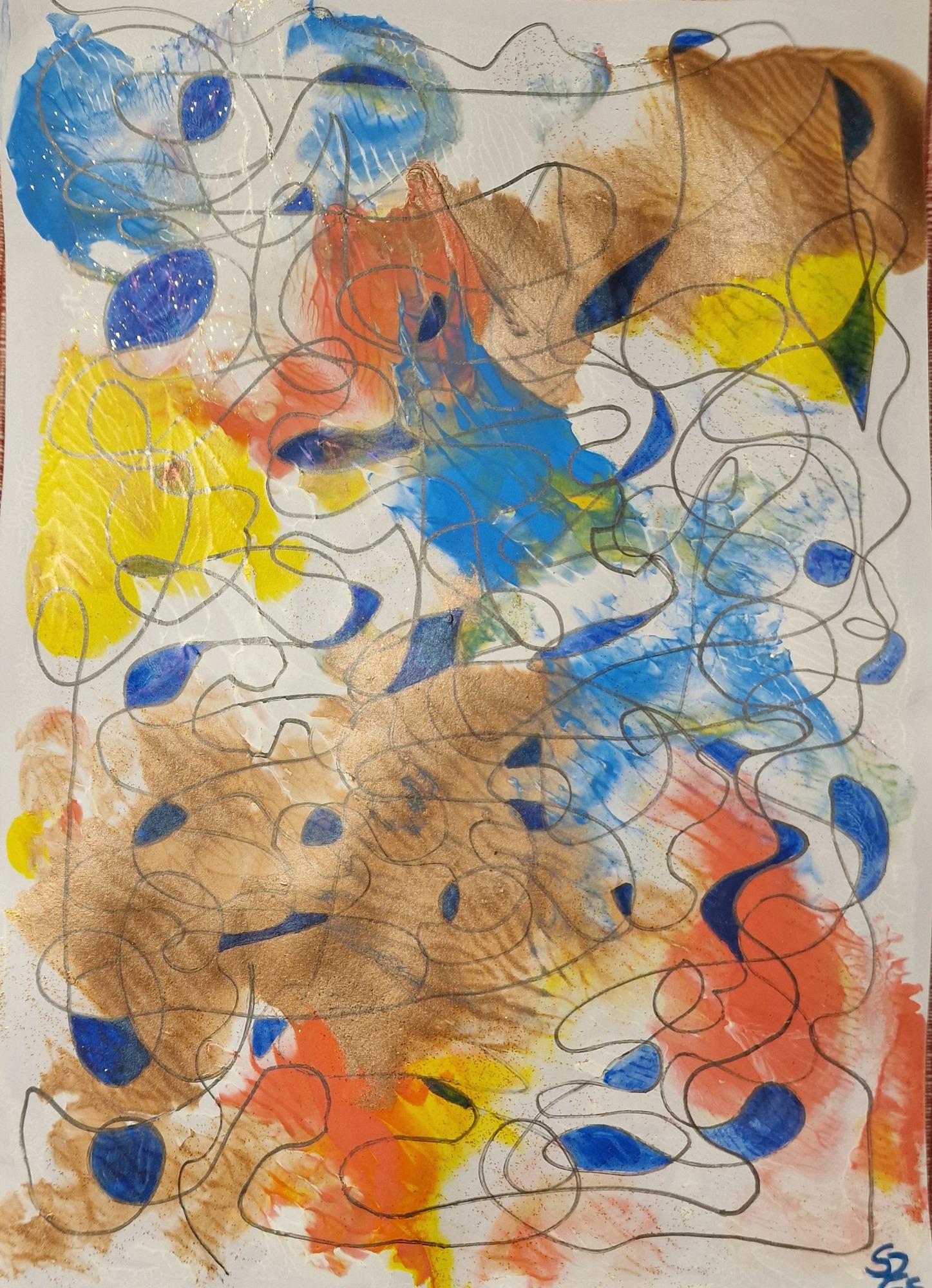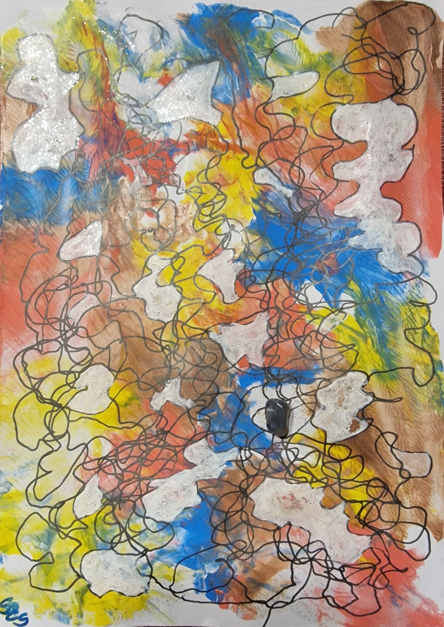 Mit geschlossenen Augen wird Musik zur Spur auf dem Papier - Linien entstehen aus dem Fühlen heraus, geführt von Klang, Bewegung und innerer Wahrnehmung. Ein Stein, sanft geschoben, weist den Weg und lässt Formen entstehen, die dem Moment entspringen. Farben bringen das Unsichtbare zum Leuchten und machen Emotionen greifbar. So wird Musik zu einem Ausdruck bewusster Gedanken, von Liebe, Verbundenheit und der leisen Verantwortung sich selbst gegenüber.