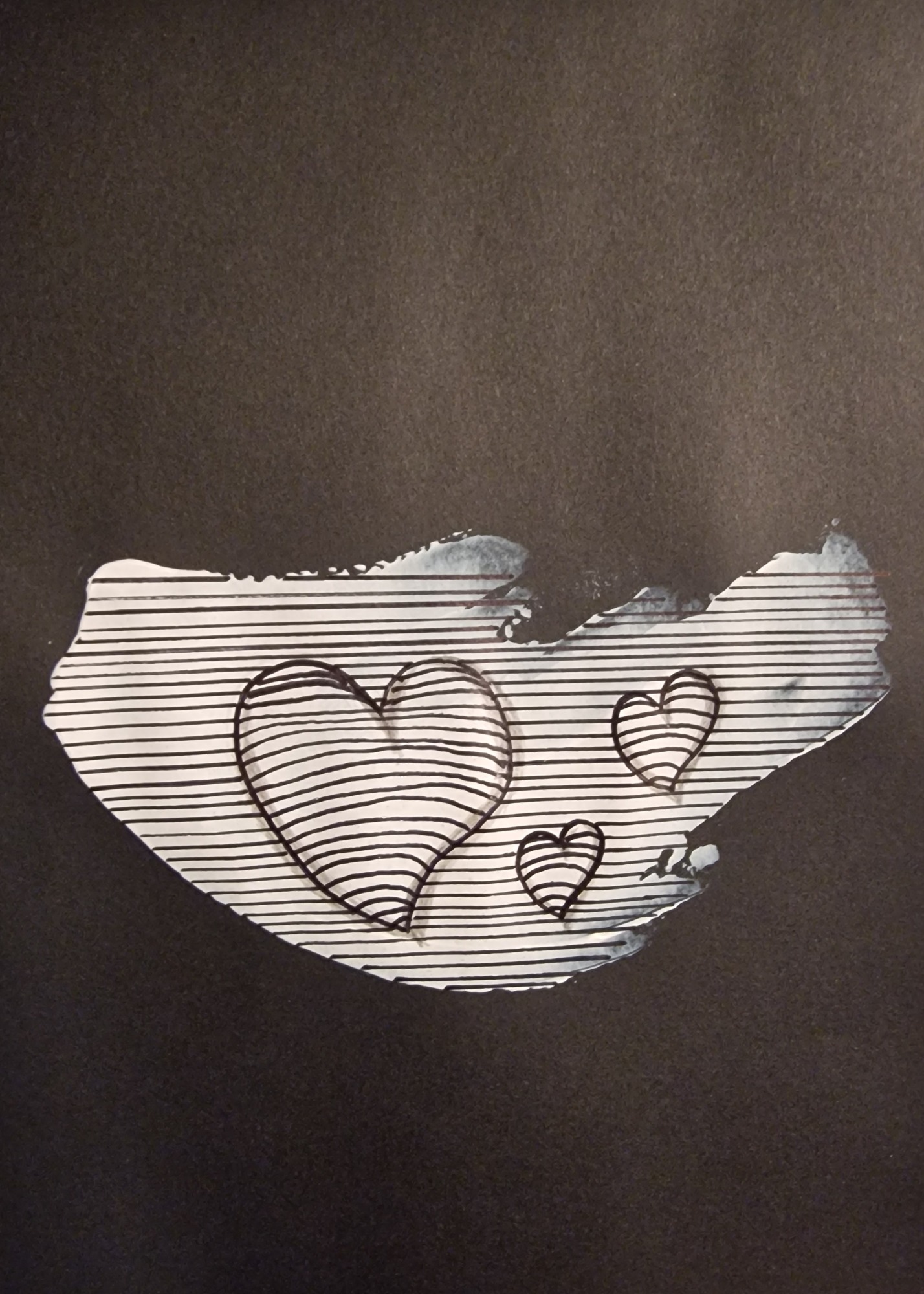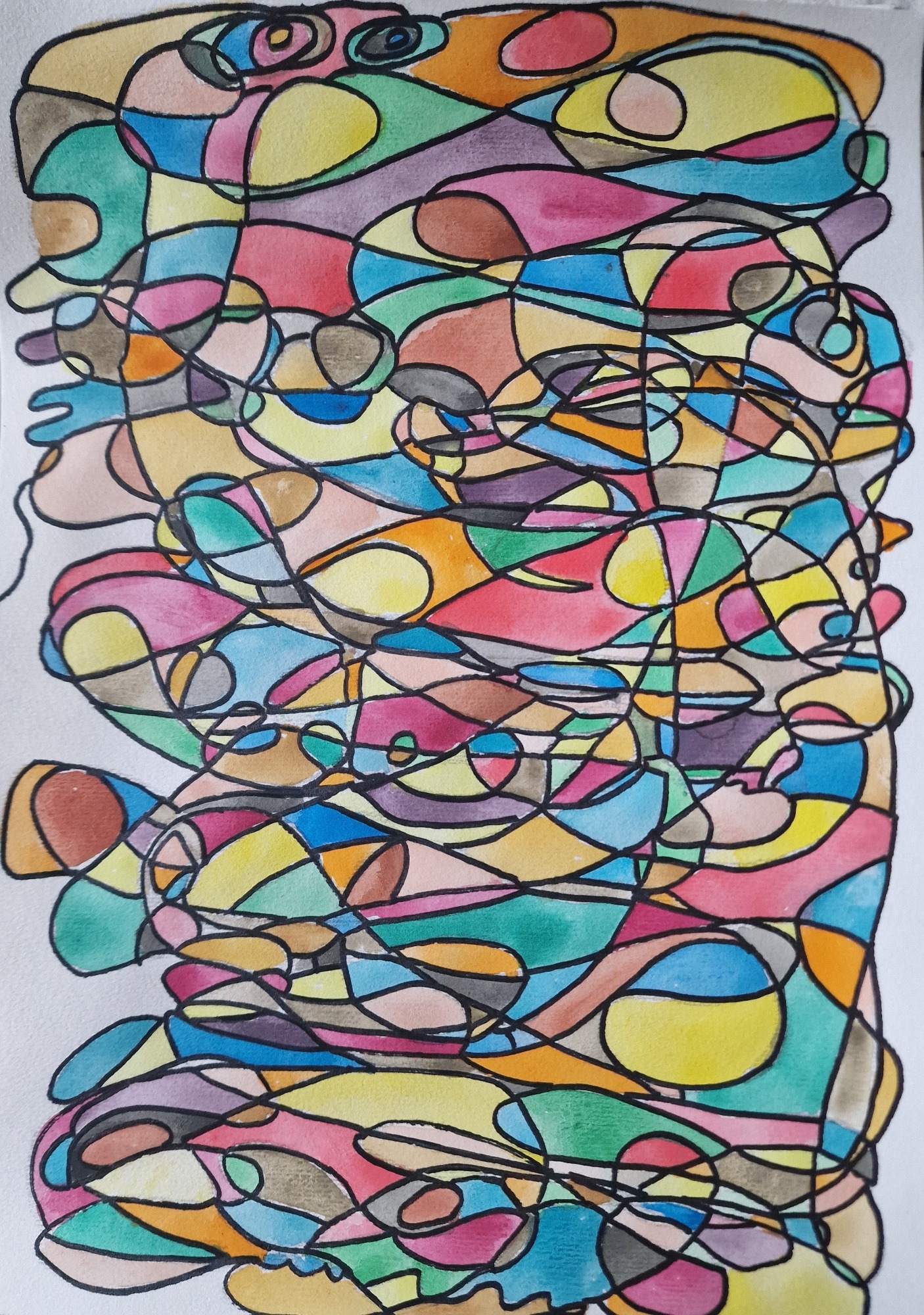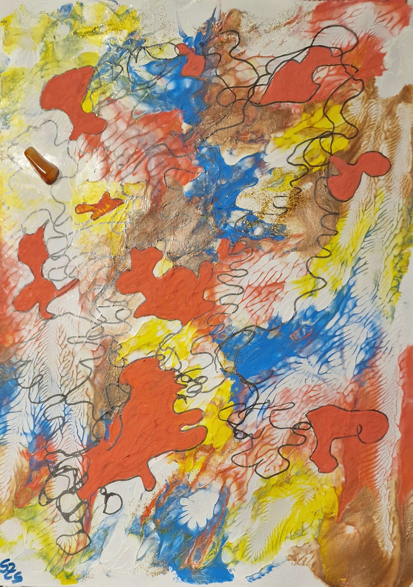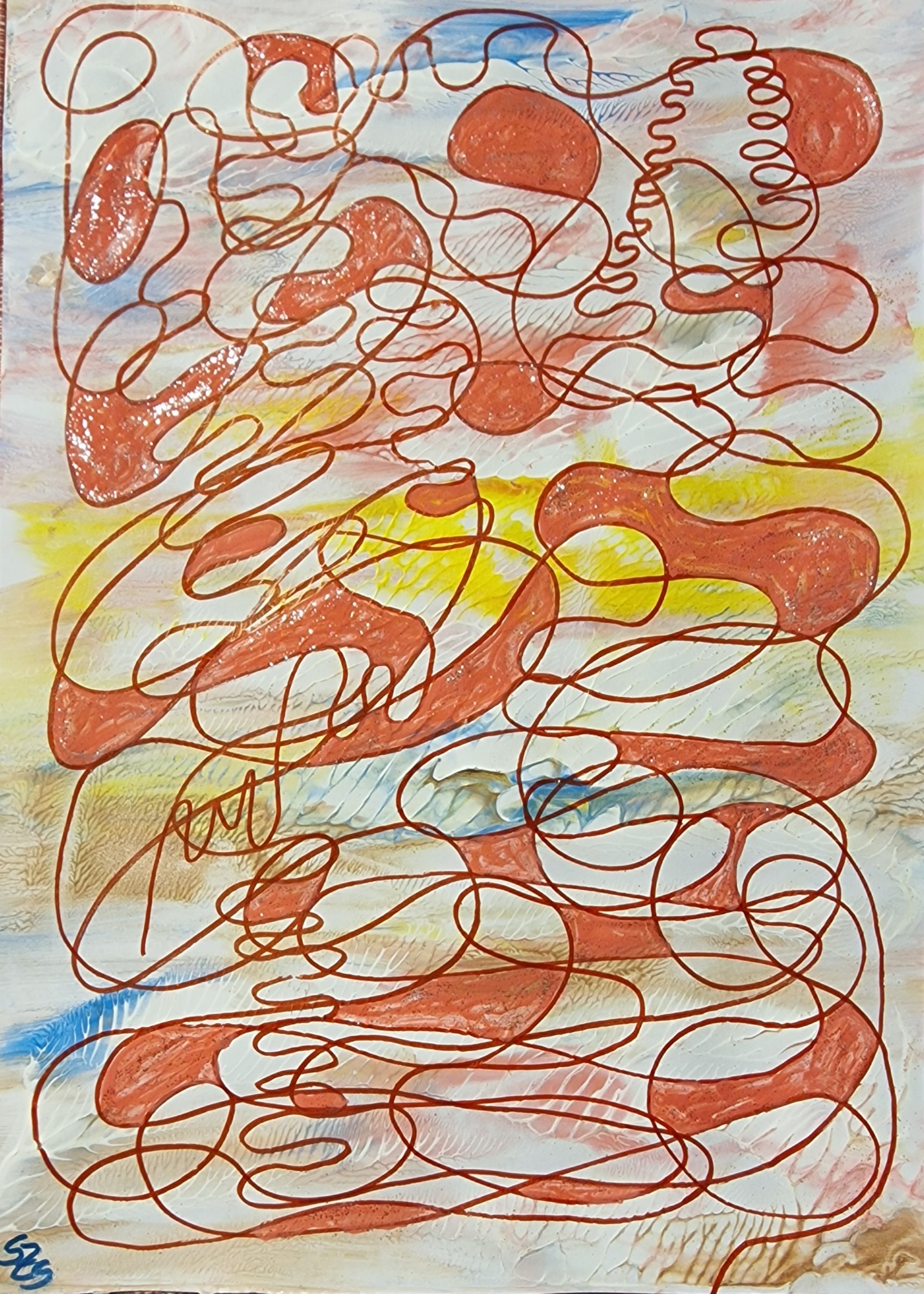 Mit geschlossenen Augen wird Musik zur Spur auf dem Papier - Linien entstehen aus dem Fühlen heraus, geführt von Klang, Bewegung und innerer Wahrnehmung. Ein Stein, sanft geschoben, weist den Weg und lässt Formen entstehen, die dem Moment entspringen. Farben bringen das Unsichtbare zum Leuchten und machen Emotionen greifbar. So wird Musik zu einem Ausdruck bewusster Gedanken, von Liebe, Verbundenheit und der leisen Verantwortung sich selbst gegenüber.