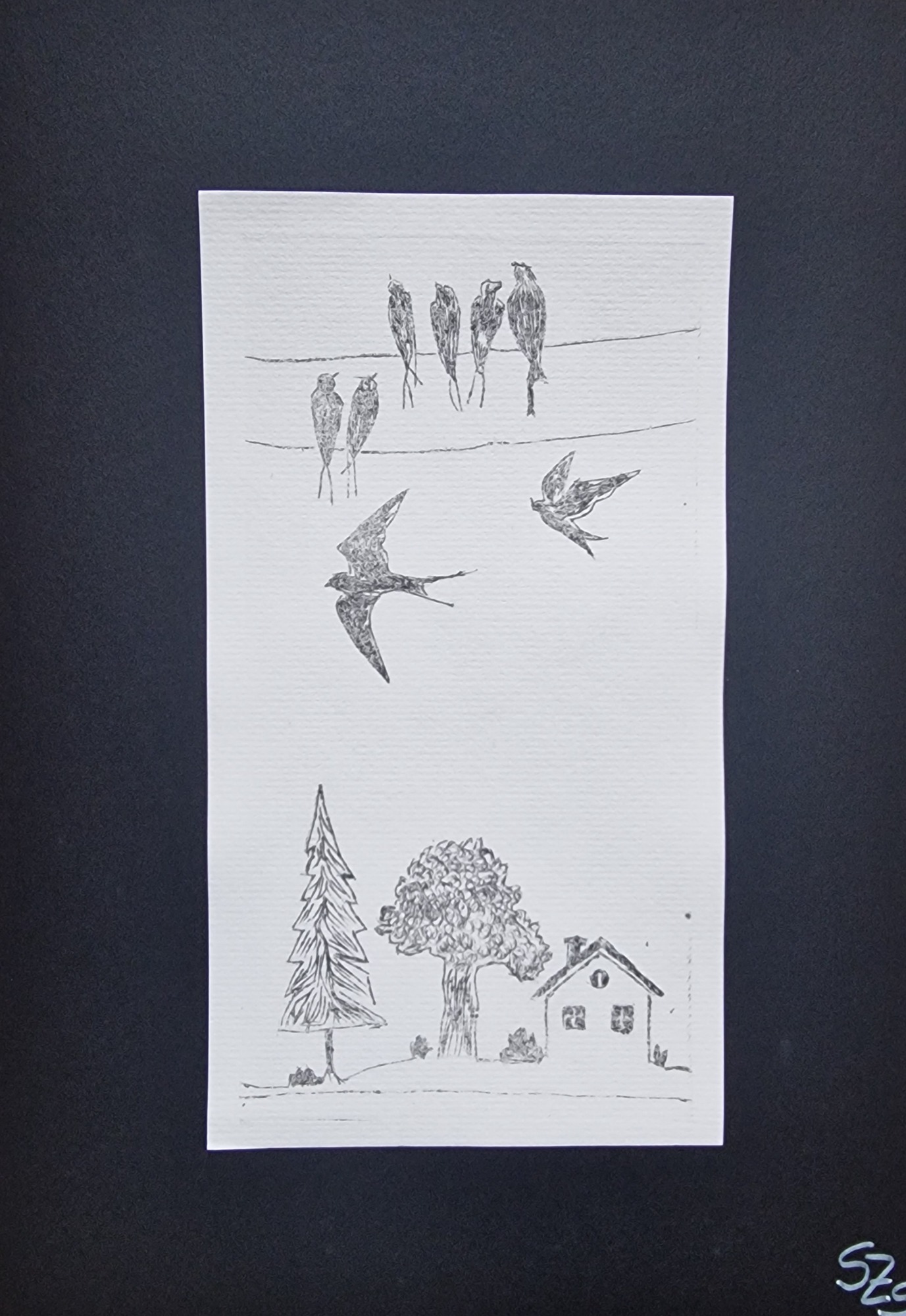 Im August geht es um Schöpferkraft, Fülle und Verwirklichung der eigenen Vision. Für mein Kreativprojekt entstand eine Radierung auf Plexiglas mit fliegenden und ruhenden Schwalben, einem Zuhause und Bäumen. Die Szene verbindet das Gefühl von Zuhause und eine stille Verbundenheit mit der Natur. Die feinen Linien lassen Leichtigkeit entstehen.