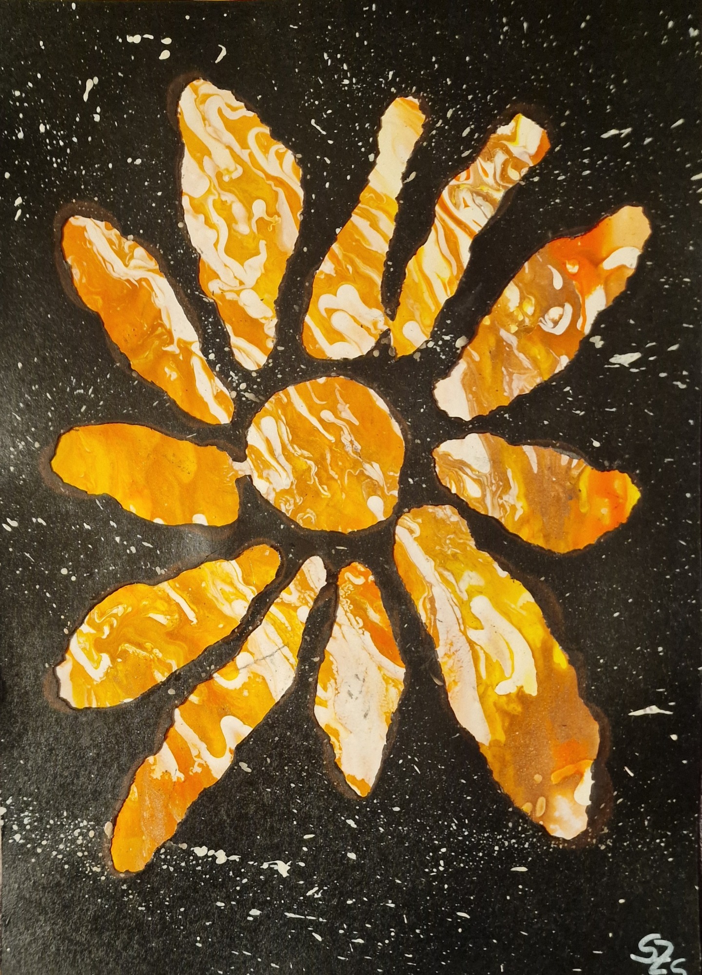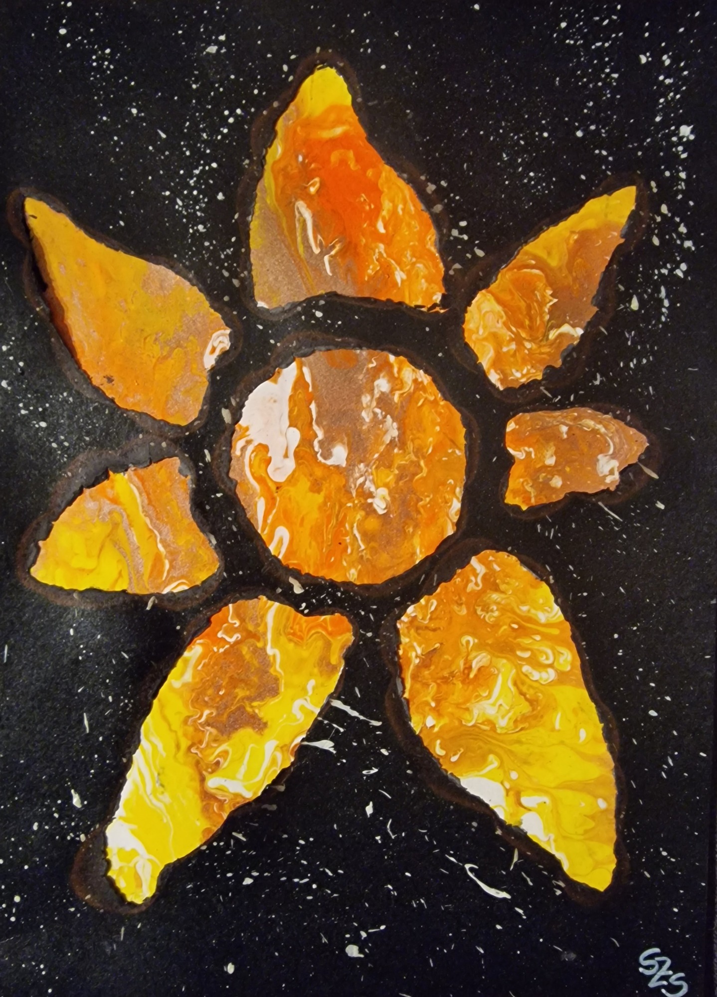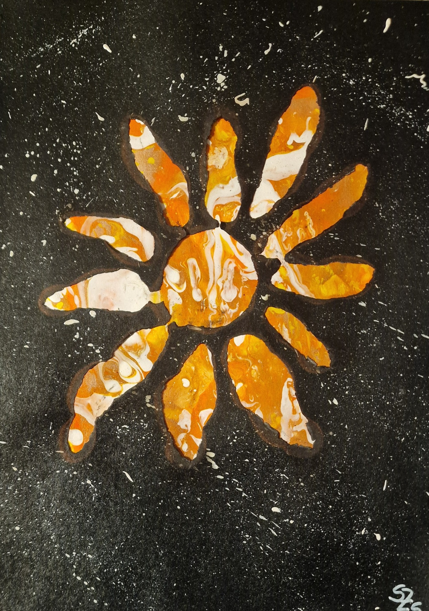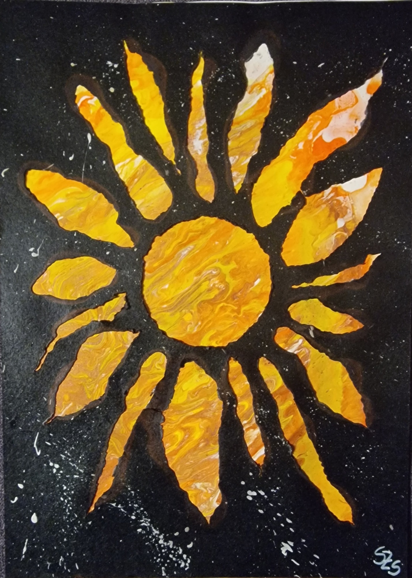 Ein fließendes Pouring in Gelb, Weiß und Orange bildet den Hintergrund - Farben wie Sonne, Wärme und neuem Licht. Darüber liegt ein schwarzes Papier. Mit weißer Farbe gesprenkelt entsteht ein Sternenhimmel. In das Papier sind Öffnungen eingebrannt und wie Sonnenstrahlen angeordnet. Durch diese tritt das leuchtende Pouring hervor. Das Werk greift den Moment der Wintersonnenwende auf - den Wendepunkt, an dem aus der längsten Nacht neues Licht entsteht.