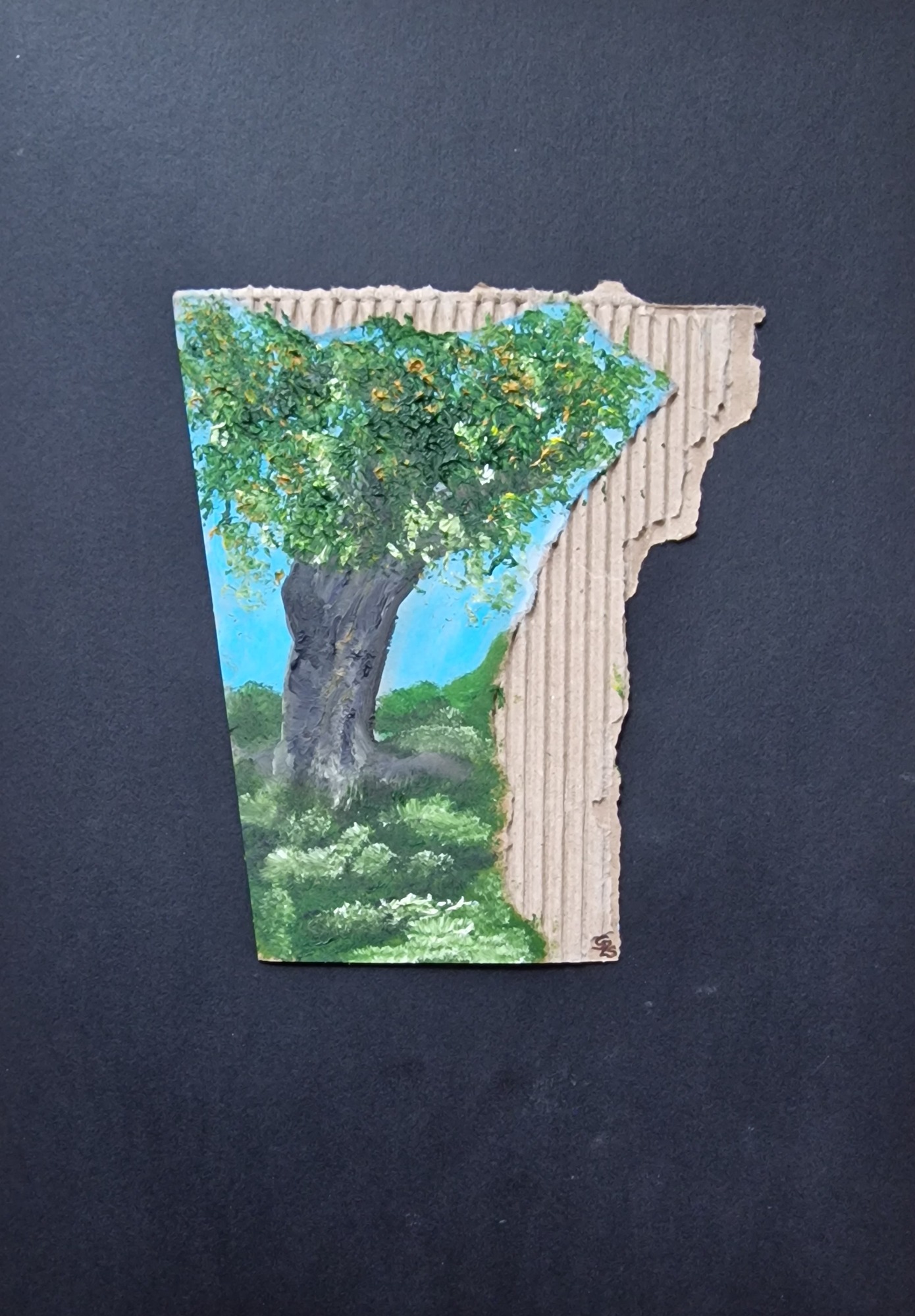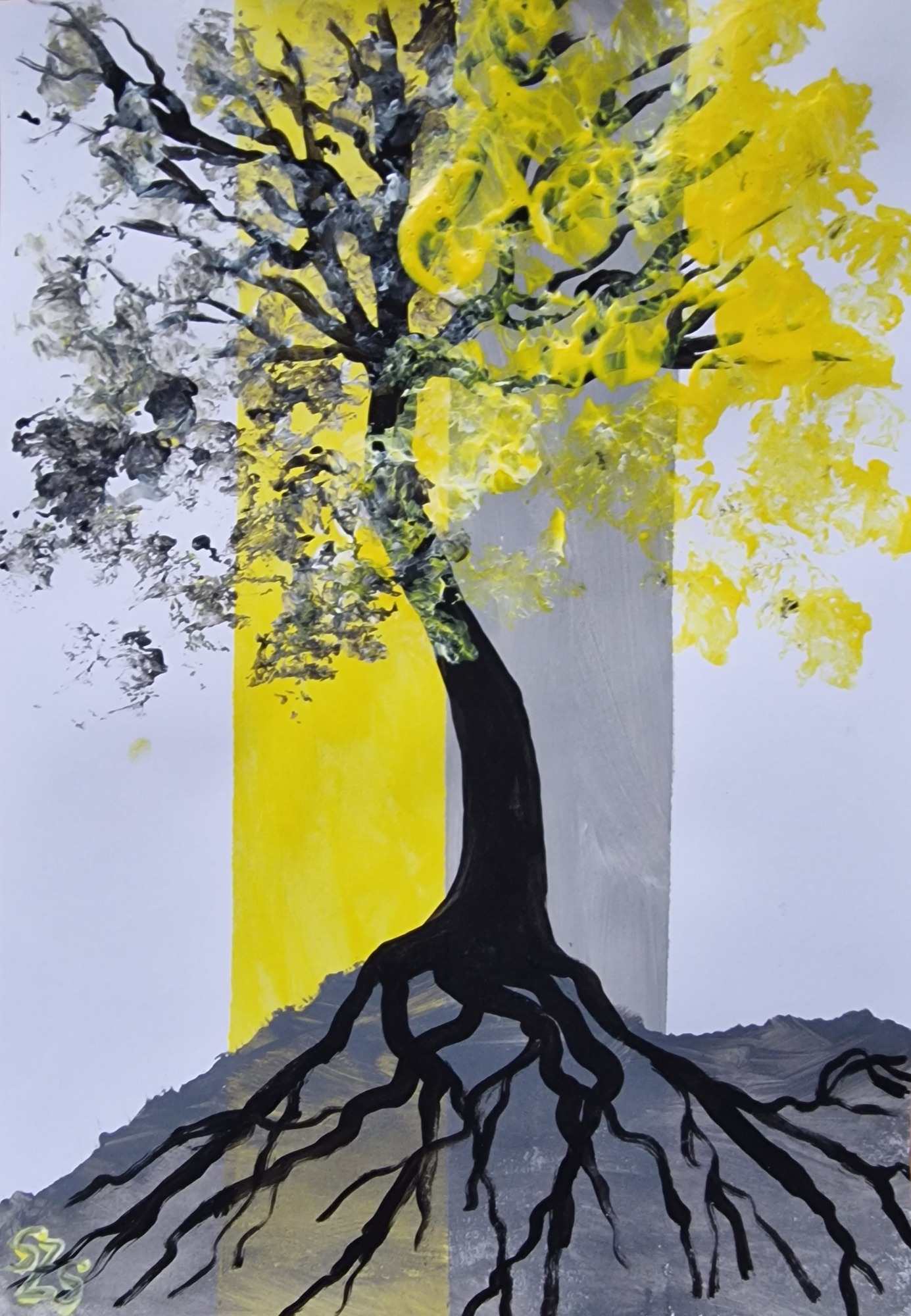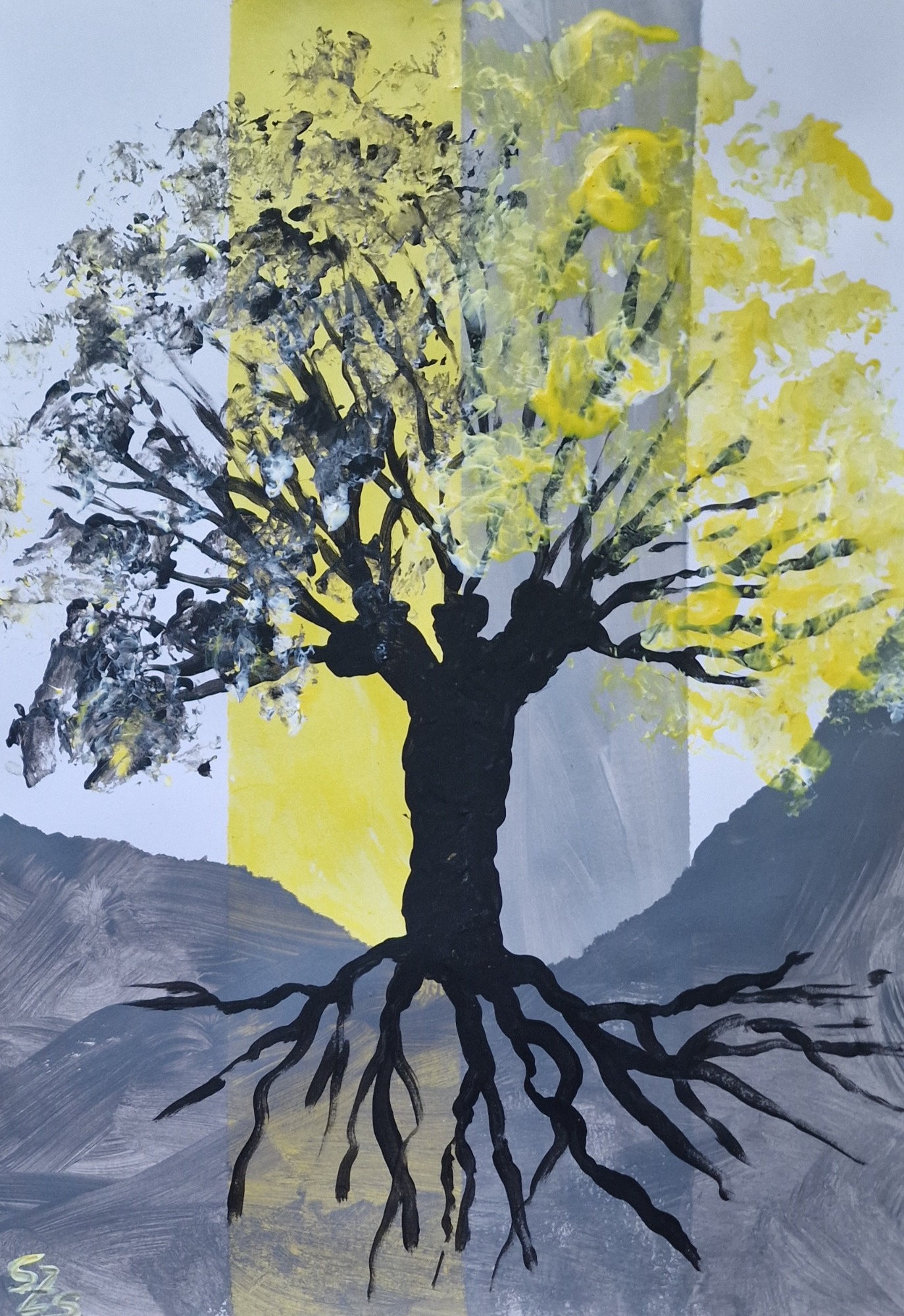 Mit Acryl gemalt, zeigen diese Werke einen Baum zwischen zwei Seiten: Auf der einen leuchtet Gelb vor grauem Hintergrund, mit reichem Blattwerk. Auf der anderen ist der Baum reduzierter, in Grautönen und mit weniger Blättern.