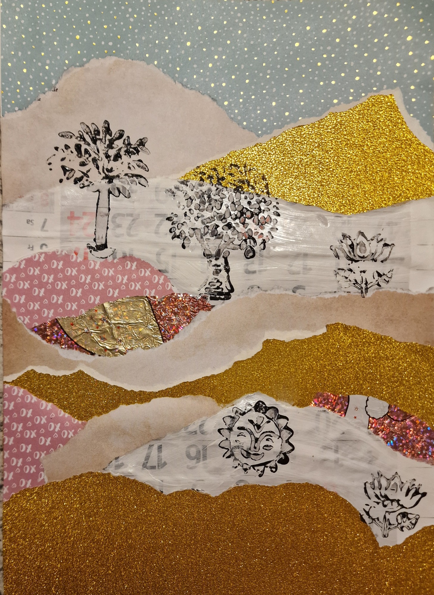 Im Kreativprojekt für Juni fangen wir die Themen dieser Rauhnacht ein: Wir sammeln über den Tag hinweg Papierstücke, die berühren – Augenblicke der Schönheit, die Balance schenken oder aktiv inspirieren. Am Abend reißen wir daraus Schnipsel, lassen los und ordnen sie neu zu einem Gebirge. Das entstehende Bild spiegelt das Innere wider: Die Schnipsel erzählen von Momenten, die uns ausbalancieren und Kraft geben. Ein Kunstwerk, das uns erinnert, loszulassen und gleichzeitig Neues entstehen zu lassen. Ein Begleiter für den kommenden Juni.